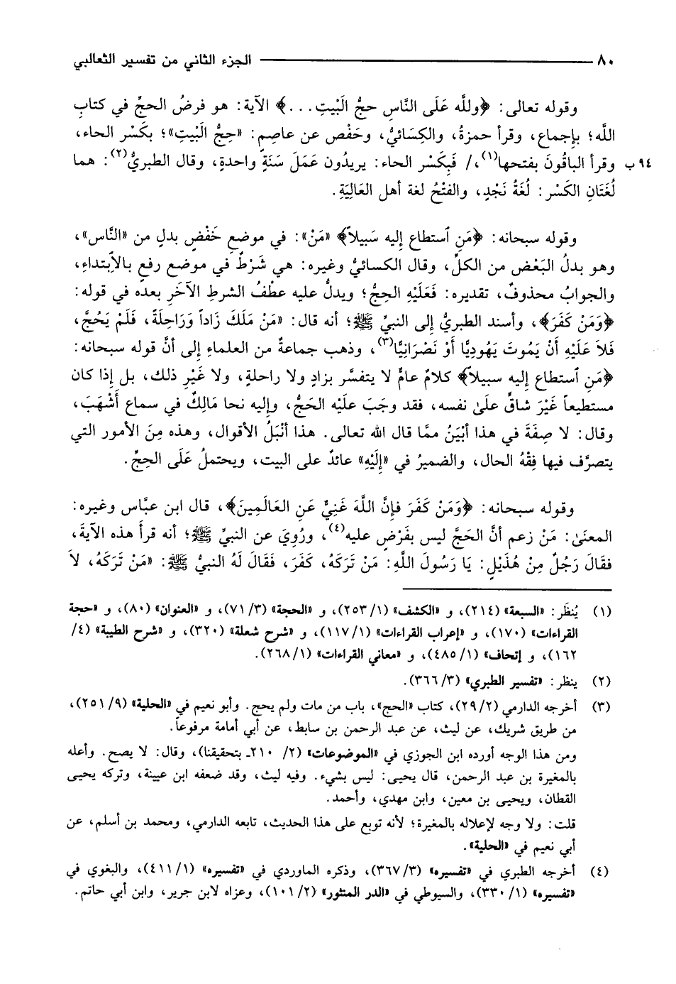 وَمَنْ كَفَرَ، وأسند الطبريُّ إلى النبيِّ صلّى الله عليه وسلّم أنه قال: «مَنْ مَلَكَ زَاداً وَرَاحِلَةً، فَلَمْ يَحُجَّ، فَلاَ عَلَيْهِ أَنْ يَمُوتَ يَهُودِيًّا أَوْ نَصْرَانِيًّا «3» ، وذهب جماعةٌ من العلماءِ إلى أنَّ قوله سبحانه: