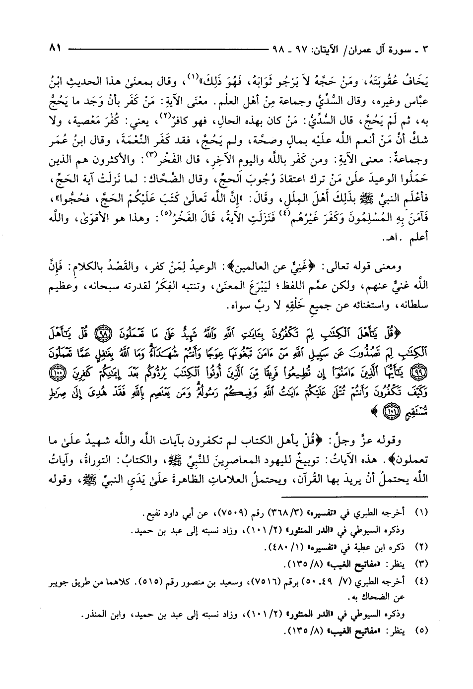 يَخَافُ عُقُوبَتَهُ، ومَنْ حَجَّهُ لاَ يَرْجُو ثَوَابَهُ، فَهُوَ ذَلِكَ» «1» ، وقال بمعنى هذا الحديثِ ابْنُ عبَّاس وغيره، وقال السُّدِّيُّ وجماعة مِنْ أهْل العلْم. معْنَى الآيةِ: مَنْ كَفَر بأنْ وَجَد ما يَحُجُّ به، ثم لَمْ يَحُجَّ، قال السُّدِّيُّ: مَنْ كان بهذه الحالِ، فهو كافرٌ «2» ، يعني: كُفْرَ مَعْصية، ولا شكَّ أنَّ مَنْ أنعم اللَّه علَيْه بمالٍ وصحَّة، ولم يَحُجَّ، فقد كَفَر النِّعْمَةَ، وقال ابنُ عُمَر وجماعةٌ: معنى الآيةِ: ومن كَفَر باللَّه واليومِ الآخِرِ، قال الفَخْر «3» : والأكثرون هم الذين حَمَلُوا الوعيدَ على مَنْ ترك اعتقادَ وُجُوبَ الحجِّ، وقال الضَّحَّاك: لما نَزلَتْ آية الحَجِّ، فأعْلَمِ النبيُّ صلّى الله عليه وسلّم بذَلِكَ أَهْلَ المِلَلِ، وقَالَ: «إنَّ اللَّه تعالى كَتَبَ عَلَيْكُمْ الحَجُّ، فحُجُّوا» ، فَآمَنَ بِهِ المُسْلِمُونَ وَكَفَرَ غَيْرُهُم «4» فَنَزَلَتِ الآيةُ، قَالَ الفَخْرُ «5» : وهذا هو الأقوى، واللَّه أعلم. اهـ.