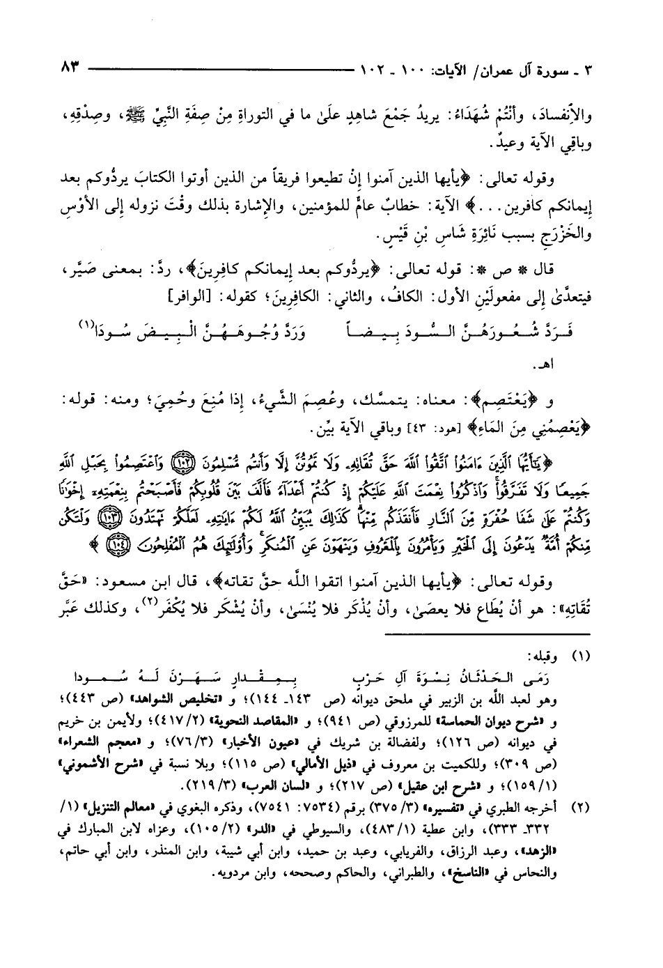 وقوله تعالى: يا أَيُّهَا الَّذِينَ آمَنُوا إِنْ تُطِيعُوا فَرِيقاً مِنَ الَّذِينَ أُوتُوا الْكِتابَ يَرُدُّوكُمْ بَعْدَ إِيمانِكُمْ كافِرِينَ ... الآية: خطابٌ عامٌّ للمؤمنين، والإشارة بذلك وقْتَ نزوله إلى الأوْسِ والخَزْرَجِ بسبب نَائِرَةِ شَاسِ بْنِ قَيْسٍ.
