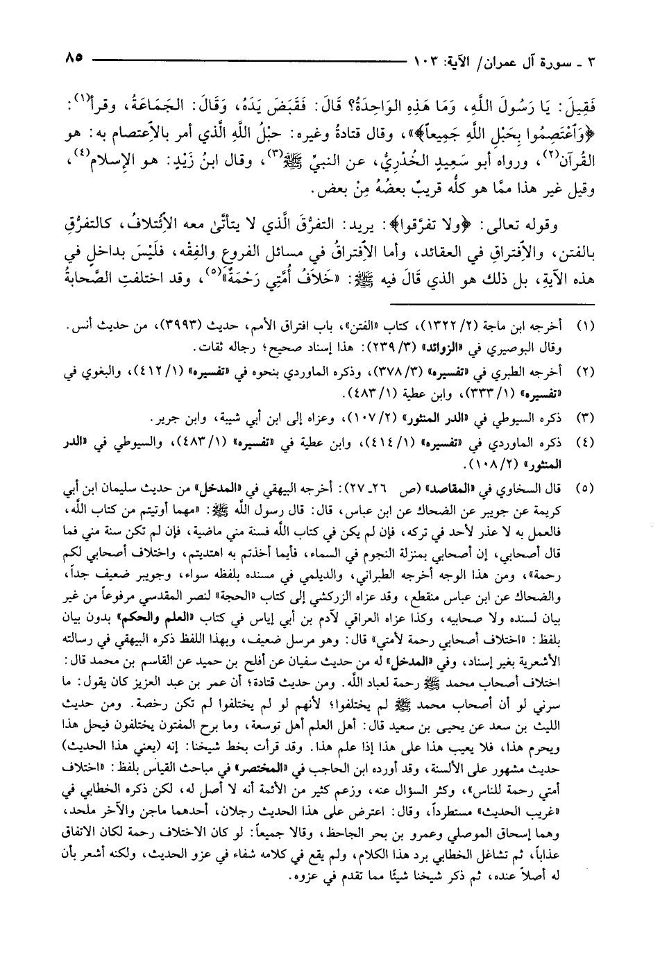 (5) قال السخاوي في «المقاصد» (ص 26- 27) : أخرجه البيهقي في «المدخل» من حديث سليمان ابن أبي كريمة عن جويبر عن الضحاك عن ابن عباس، قال: قال رسول الله صلّى الله عليه وسلّم: «مهما أوتيتم من كتاب الله، فالعمل به لا عذر لأحد في تركه، فإن لم يكن في كتاب الله فسنة مني ماضية، فإن لم تكن سنة مني فما قال أصحابي، إن أصحابي بمنزلة النجوم في السماء، فأيما أخذتم به اهتديتم، واختلاف أصحابي لكم رحمة» ، ومن هذا الوجه أخرجه الطبراني، والديلمي في مسنده بلفظه سواء، وجويبر ضعيف جدا، والضحاك عن ابن عباس منقطع، وقد عزاه الزركشي إلى كتاب «الحجة» لنصر المقدسي مرفوعا من غير بيان لسنده ولا صحابيه، وكذا عزاه العراقي لآدم بن أبي إياس في كتاب «العلم والحكم» بدون بيان بلفظ: «اختلاف أصحابي رحمة لأمتي» قال: وهو مرسل ضعيف، وبهذا اللفظ ذكره البيهقي في رسالته الأشعرية بغير إسناد، وفي «المدخل» له من حديث سفيان عن أفلح بن حميد عن القاسم بن محمد قال: