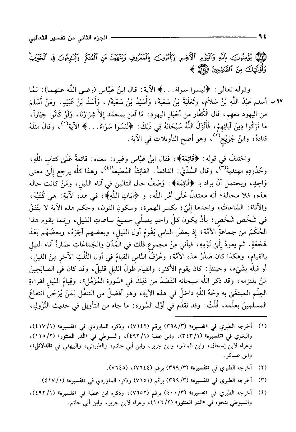 وقوله تعالى: لَيْسُوا سَواءً ... الآية: قال ابنُ عَبَّاس (رضي اللَّه عنهما) : لمَّا أسلم عَبْدُ اللَّهِ بْنُ سَلاَمٍ، وثَعْلَبَةُ بْنُ سَعْيَةَ، وَأُسَيْدُ بْنُ سَعْيَةَ/، وَأَسَدُ بْنُ عُبَيْدٍ، ومَنْ أَسْلَمَ من اليهود معهم، قال الكُفَّار من أحْبَارِ اليهودِ: مَا آمن بمحمَّد إلاَّ شِرَارُنَا، وَلَوْ كَانُوا خِيَاراً، ما تَرَكُوا دِينَ آبائِهِمْ، فَأَنْزَلَ اللَّهُ سُبْحَانَهُ فِي ذَلِكَ: لَيْسُوا سَواءً ... الآية «1» ، وقالَ مثلَهُ قتادةُ، وابنُ جُرَيْجٍ «2» ، وهو أصح التأويلات في الآية.