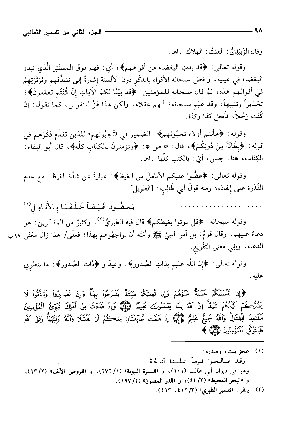 وقوله تعالى: عَضُّوا عَلَيْكُمُ الْأَنامِلَ مِنَ الْغَيْظِ: عبارةٌ عن شدَّة الغيظِ، مع عدم القُدْرة على إنفاذه ومنه قولُ أبي طَالِبٍ: [الطويل]