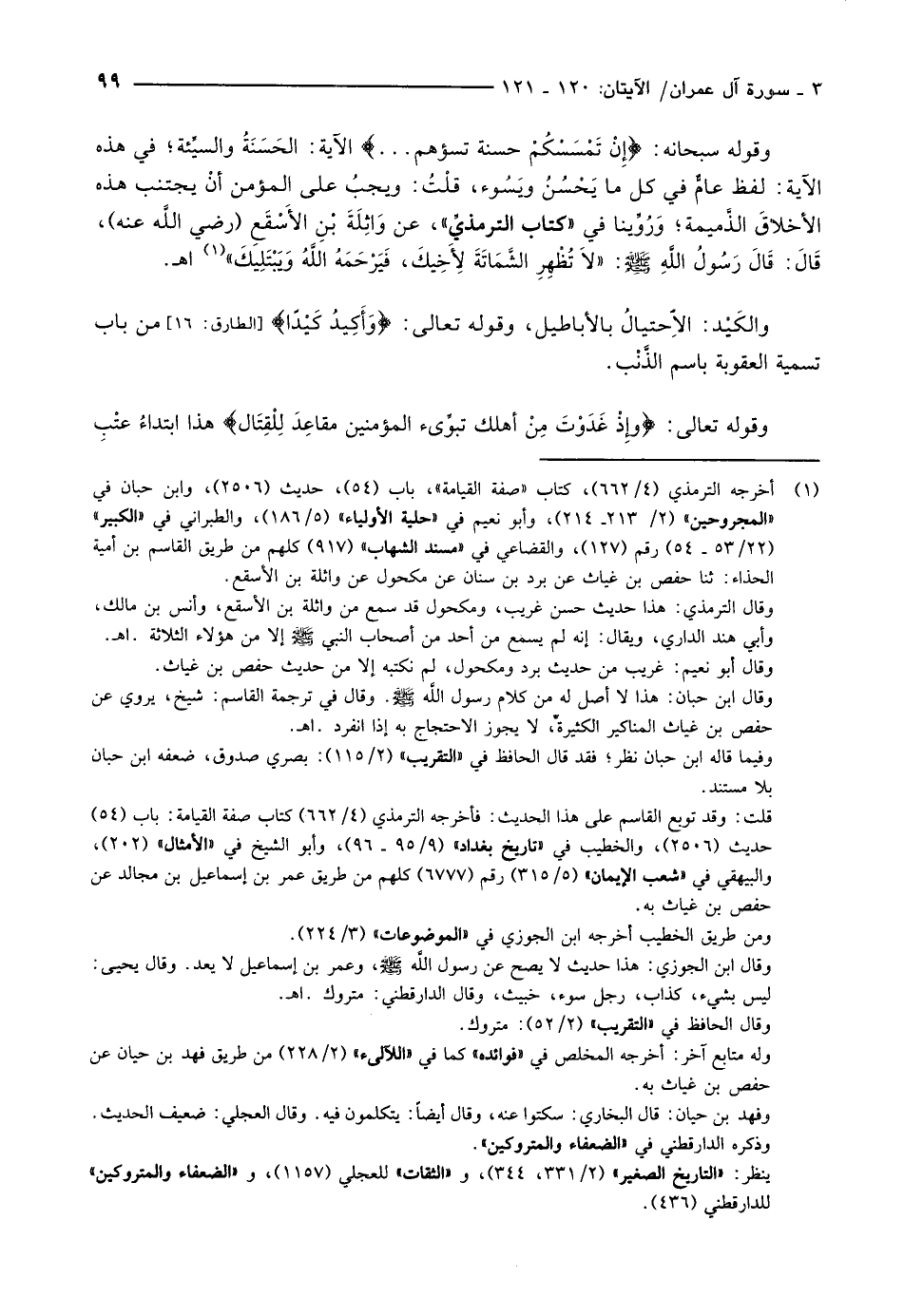 وقوله سبحانه: إِنْ تَمْسَسْكُمْ حَسَنَةٌ تَسُؤْهُمْ ... الآية: الحَسَنَةُ والسيِّئة في هذه الآية: لفظ عامٌّ في كل ما يَحْسُنُ ويَسُوء، قلْتُ: ويجبُ على المؤمن أن يجتنب هذه الأخلاق الذميمة وَرُوِّينا في «كتاب الترمذيِّ» ، عن وَاثِلَةَ بْنِ الأَسْقَعِ (رضي اللَّه عنه) ، قَالَ: قَالَ رَسُولُ الله صلّى الله عليه وسلّم: «لاَ تُظْهِرِ الشَّمَاتَةَ لأخِيكَ، فَيَرْحَمَهُ اللَّهُ وَيَبْتَلِيكَ» «1» اهـ.