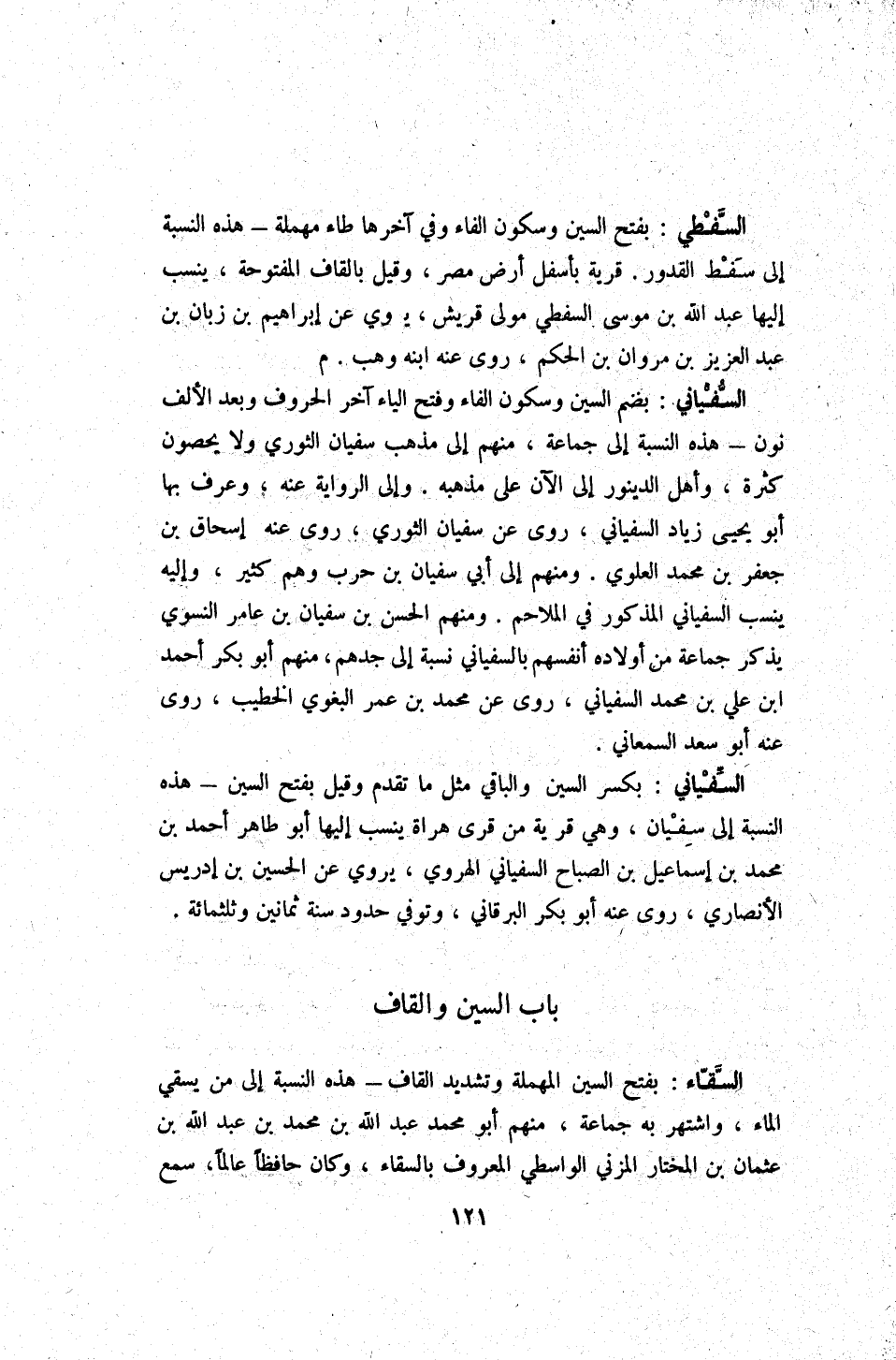 السفياني بِضَم السِّين وَسُكُون الْفَاء وَفتح الْيَاء آخر الْحُرُوف وَبعد الْألف نون - هَذِه النِّسْبَة إِلَى جمَاعَة مِنْهُم إِلَى مَذْهَب سُفْيَان الثَّوْريّ وَلَا يُحصونَ كَثْرَة وَأهل الدينور إِلَى الْآن على مذْهبه وَإِلَى الرِّوَايَة عَنهُ وَعرف بهَا أَبُو يحيى زِيَاد السفياني روى عَن سُفْيَان الثَّوْريّ روى عَنهُ إِسْحَاق بن جَعْفَر بن مُحَمَّد الْعلوِي وَمِنْهُم إِلَى أبي سُفْيَان بن حَرْب وهم كثير وَإِلَيْهِ ينْسب السفياني الْمَذْكُور فِي الْمَلَاحِم وَمِنْهُم الْحسن بن سُفْيَان بن عَامر النسوي يذكر جمَاعَة من أَوْلَاده أنفسهم بالسفياني نِسْبَة إِلَى جدهم مِنْهُم أَبُو بكر أَحْمد ابْن عَليّ بن مُحَمَّد السفياني روى عَن مُحَمَّد بن عمر الْبَغَوِيّ الْخَطِيب روى عَنهُ أَبُو سعد السَّمْعَانِيّ