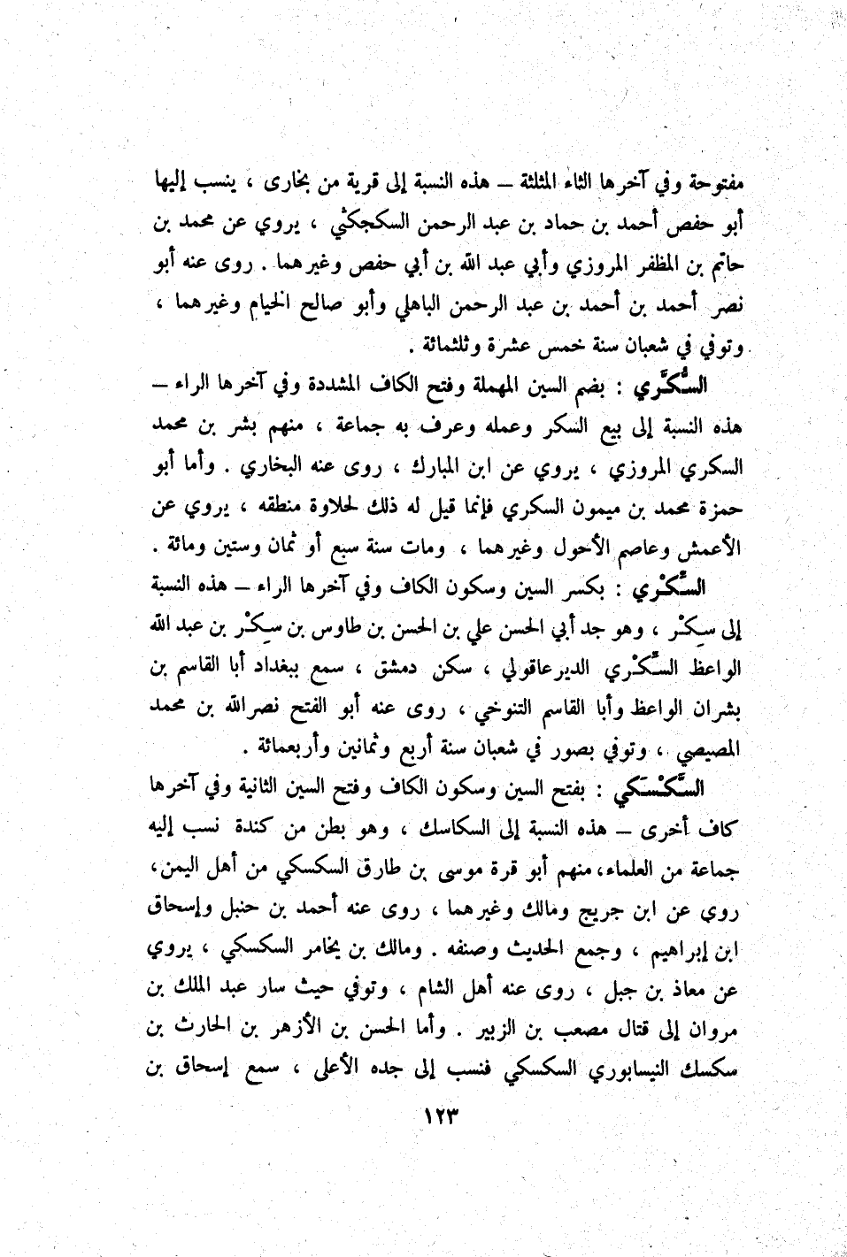 السكرِي بِضَم السِّين الْمُهْملَة وَفتح الْكَاف الْمُشَدّدَة وَفِي آخرهَا الرَّاء - هَذِه النِّسْبَة إِلَى بيع السكر وَعَمله وَعرف بِهِ جمَاعَة مِنْهُم بشر بن مُحَمَّد السكرِي الْمروزِي يروي عَن ابْن الْمُبَارك روى عَنهُ البُخَارِيّ وَأما أَبُو حَمْزَة مُحَمَّد بن مَيْمُون السكرِي فَإِنَّمَا قيل لَهُ ذَلِك لحلاوة مَنْطِقه يروي عَن الْأَعْمَش وَعَاصِم الْأَحول وَغَيرهمَا وَمَات سنة سبع أَو ثَمَان وَسِتِّينَ وَمِائَة