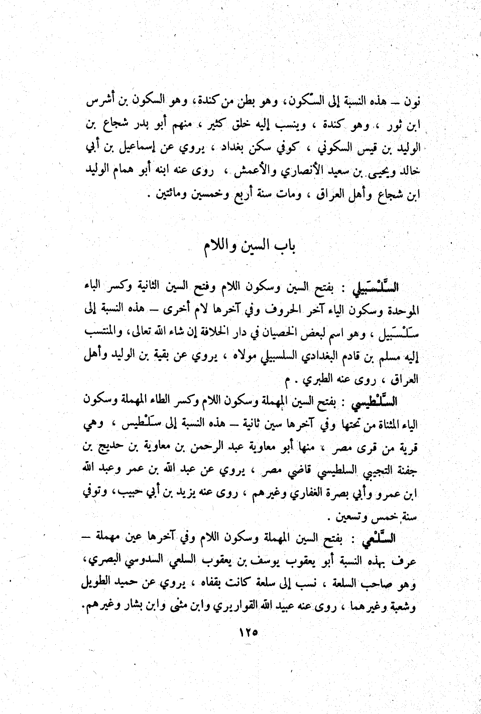 نون - هَذِه النِّسْبَة إِلَى السّكُون وَهُوَ بطن من كِنْدَة وَهُوَ السّكُون بن أَشْرَس ابْن ثَوْر وَهُوَ كِنْدَة وينسب إِلَيْهِ خلق كثير مِنْهُم أَبُو بدر شُجَاع بن الْوَلِيد بن قيس السكونِي كُوفِي سكن بَغْدَاد يروي عَن إِسْمَاعِيل بن أبي خَالِد وَيحيى بن سعيد الْأنْصَارِيّ وَالْأَعْمَش روى عَنهُ ابْنه أَبُو همام الْوَلِيد ابْن شُجَاع وَأهل الْعرَاق وَمَات سنة أَربع وَخمسين وَمِائَتَيْنِ