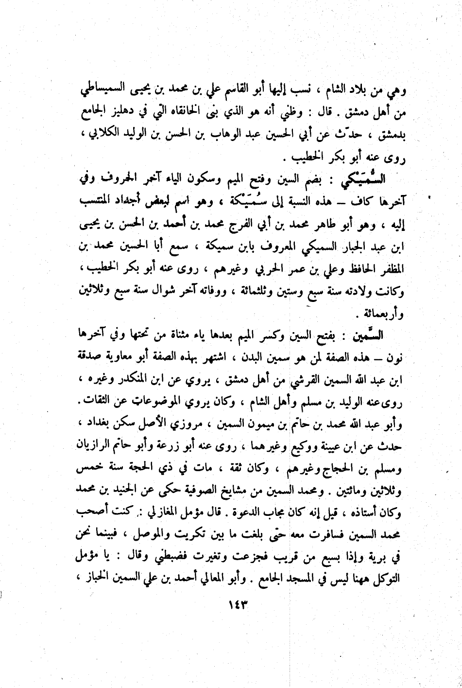 السمين بِفَتْح السِّين وَكسر الْمِيم بعْدهَا يَاء مثناة من تحتهَا وَفِي آخرهَا نون - هَذِه الصّفة لمن هُوَ سمين الْبدن اشْتهر بِهَذِهِ الصّفة أَبُو مُعَاوِيَة صَدَقَة ابْن عبد الله السمين الْقرشِي من أهل دمشق يروي عَن ابْن الْمُنْكَدر وَغَيره روى عَنهُ الْوَلِيد بن مُسلم وَأهل الشَّام وَكَانَ يروي الموضوعات عَن الثِّقَات وَأَبُو عبد الله مُحَمَّد بن حَاتِم بن مَيْمُون السمين مروزي الأَصْل سكن بَغْدَاد حدث عَن ابْن عُيَيْنَة ووكيع وَغَيرهمَا روى عَنهُ أَبُو زرْعَة وَأَبُو حَاتِم الرازيان وَمُسلم بن الْحجَّاج وَغَيرهم وَكَانَ ثِقَة مَاتَ فِي ذِي الْحجَّة سنة خمس وَثَلَاثِينَ وَمِائَتَيْنِ وَمُحَمّد السمين من مَشَايِخ الصُّوفِيَّة حكى عَن الْجُنَيْد بن مُحَمَّد وَكَانَ أستاذه قيل إِنَّه كَانَ مجاب الدعْوَة قَالَ مُؤَمل المغازلي كنت أصحب مُحَمَّد السمين فسافرت مَعَه حَتَّى بلغت مَا بَين تكريت والموصل فَبَيْنَمَا نَحن فِي بَريَّة وَإِذا بِسبع من قريب فَجَزِعت وتغيرت فضبطني وَقَالَ يَا مُؤَمل التَّوَكُّل هَهُنَا لَيْسَ فِي الْمَسْجِد الْجَامِع وَأَبُو الْمَعَالِي أَحْمد بن عَليّ السمين الخباز