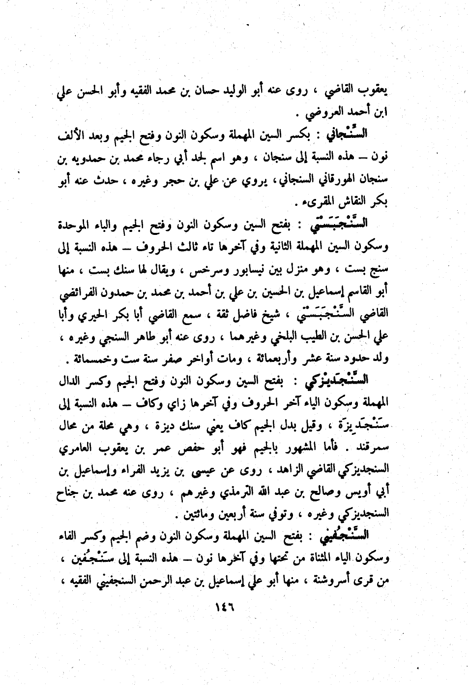 السنجاني بِكَسْر السِّين الْمُهْملَة وَسُكُون النُّون وَفتح الْجِيم وَبعد الْألف نون - هَذِه النِّسْبَة إِلَى سنجان وَهُوَ اسْم لجد أبي رَجَاء مُحَمَّد بن حَمْدَوَيْه بن سنجان الهورقاني السنجاني يروي عَن عَليّ بن حجر وَغَيره حدث عَنهُ أَبُو بكر النقاش المقرىء