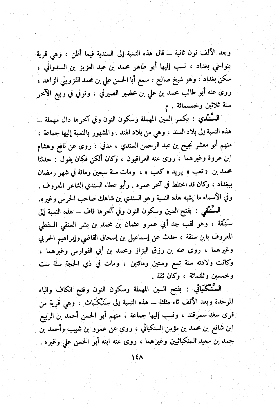 السندي بِكَسْر السِّين الْمُهْملَة وَسُكُون النُّون وَفِي آخرهَا دَال مُهْملَة - هَذِه النِّسْبَة إِلَى بِلَاد السَّنَد وَهِي من بِلَاد الْهِنْد وَالْمَشْهُور بِالنِّسْبَةِ إِلَيْهَا جمَاعَة مِنْهُم أَبُو معشر نجيح بن عبد الرَّحْمَن السندي مدنِي روى عَن نَافِع وَهِشَام بن عُرْوَة وَغَيرهمَا روى عَنهُ الْعِرَاقِيُّونَ وَكَانَ ألكن فَكَانَ يَقُول حَدثنَا مُحَمَّد بن تَعب يُرِيد كَعْب وَمَات سنة سبعين وَمِائَة فِي شهر رَمَضَان بِبَغْدَاد وَكَانَ قد اخْتَلَط فِي آخر عمره وَأَبُو عَطاء السندي الشَّاعِر الْمَعْرُوف وَفِي الْأَسْمَاء مَا يشبه هَذِه النِّسْبَة وَهُوَ السندي بن شاهك صَاحب الحرس وَغَيره