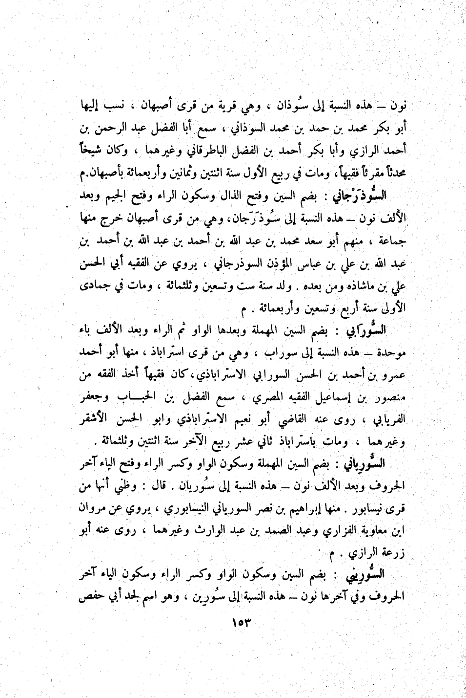 السوذرجاني بِضَم السِّين وَفتح الذَّال وَسُكُون الرَّاء وَفتح الْجِيم وَبعد الْألف نون - هَذِه النِّسْبَة إِلَى سوذرجان وَهِي من قرى أَصْبَهَان خرج مِنْهَا جمَاعَة مِنْهُم أَبُو سعد مُحَمَّد بن عبد الله بن أَحْمد بن عبد الله بن أَحْمد بن عبد الله بن عَليّ بن عَبَّاس الْمُؤَذّن السوذرجاني يروي عَن الْفَقِيه أبي الْحسن عَليّ بن ماشاذه وَمن بعده ولد سنة سِتّ وَتِسْعين وثلثمائة وَمَات فِي جُمَادَى الأولى سنة أَربع وَتِسْعين وَأَرْبَعمِائَة م