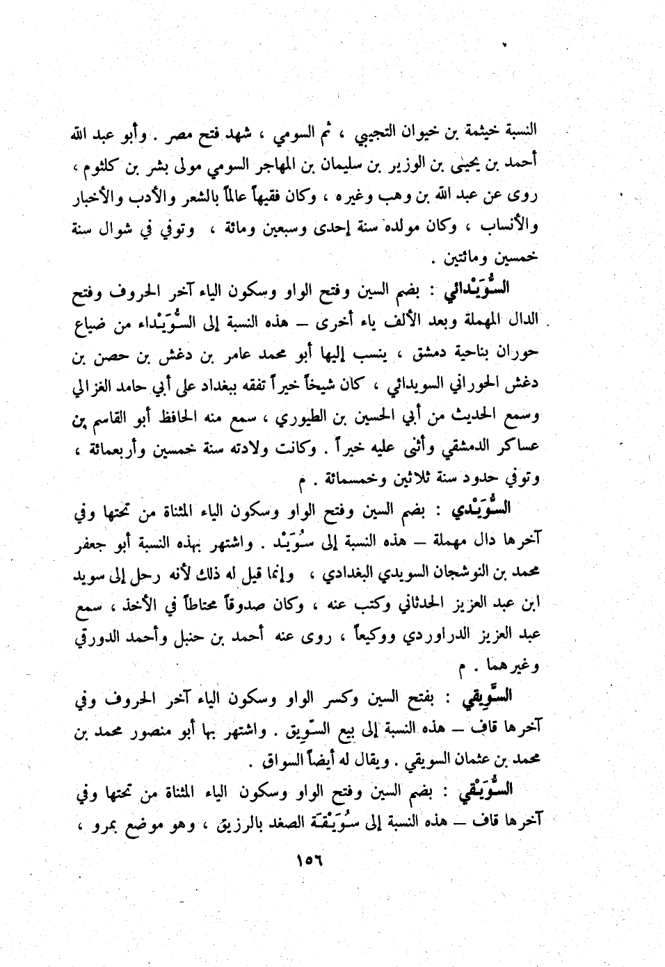 السويدي بِضَم السِّين وَفتح الْوَاو وَسُكُون الْيَاء الْمُثَنَّاة من تحتهَا وَفِي آخرهَا دَال مُهْملَة - هَذِه النِّسْبَة إِلَى سُوَيْد واشتهر بِهَذِهِ النِّسْبَة أَبُو جَعْفَر مُحَمَّد بن النوشجان السويدي الْبَغْدَادِيّ وَإِنَّمَا قيل لَهُ ذَلِك لِأَنَّهُ رَحل إِلَى سُوَيْد بن عبد الْعَزِيز الحدثاني وَكتب عَنهُ وَكَانَ صَدُوقًا محتاطا فِي الْأَخْذ سمع عبد الْعَزِيز الدَّرَاورْدِي ووكيعا روى عَنهُ أَحْمد بن حَنْبَل وَأحمد الدَّوْرَقِي وَغَيرهمَا م