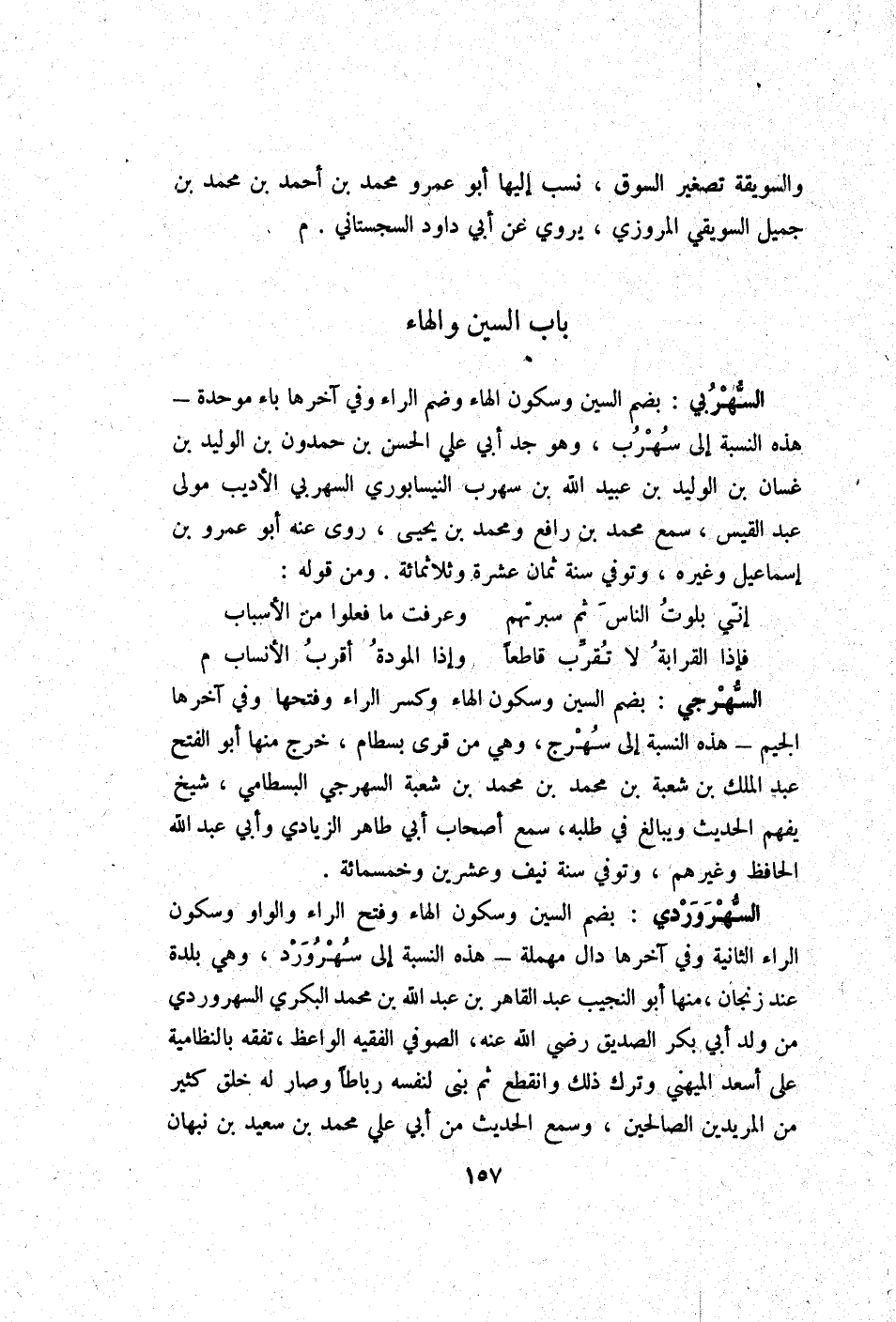 السهروردي بِضَم السِّين وَسُكُون الْهَاء وَفتح الرَّاء وَالْوَاو وَسُكُون الرَّاء الثَّانِيَة وَفِي آخرهَا دَال مُهْملَة - هَذِه النِّسْبَة إِلَى سهرورد وَهِي بَلْدَة عِنْد زنجان مِنْهَا أَبُو النجيب عبد القاهر بن عبد الله بن مُحَمَّد الْبكْرِيّ السهروردي من ولد أبي بكر الصّديق رَضِي الله عَنهُ الصُّوفِي الْفَقِيه الْوَاعِظ تفقه بالنظامية على أسعد الميهني وَترك ذَلِك وَانْقطع ثمَّ بنى لنَفسِهِ رِبَاطًا وَصَارَ لَهُ خلق كثير من المريدين الصَّالِحين وَسمع الحَدِيث من أبي عَليّ مُحَمَّد بن سعيد بن نَبهَان