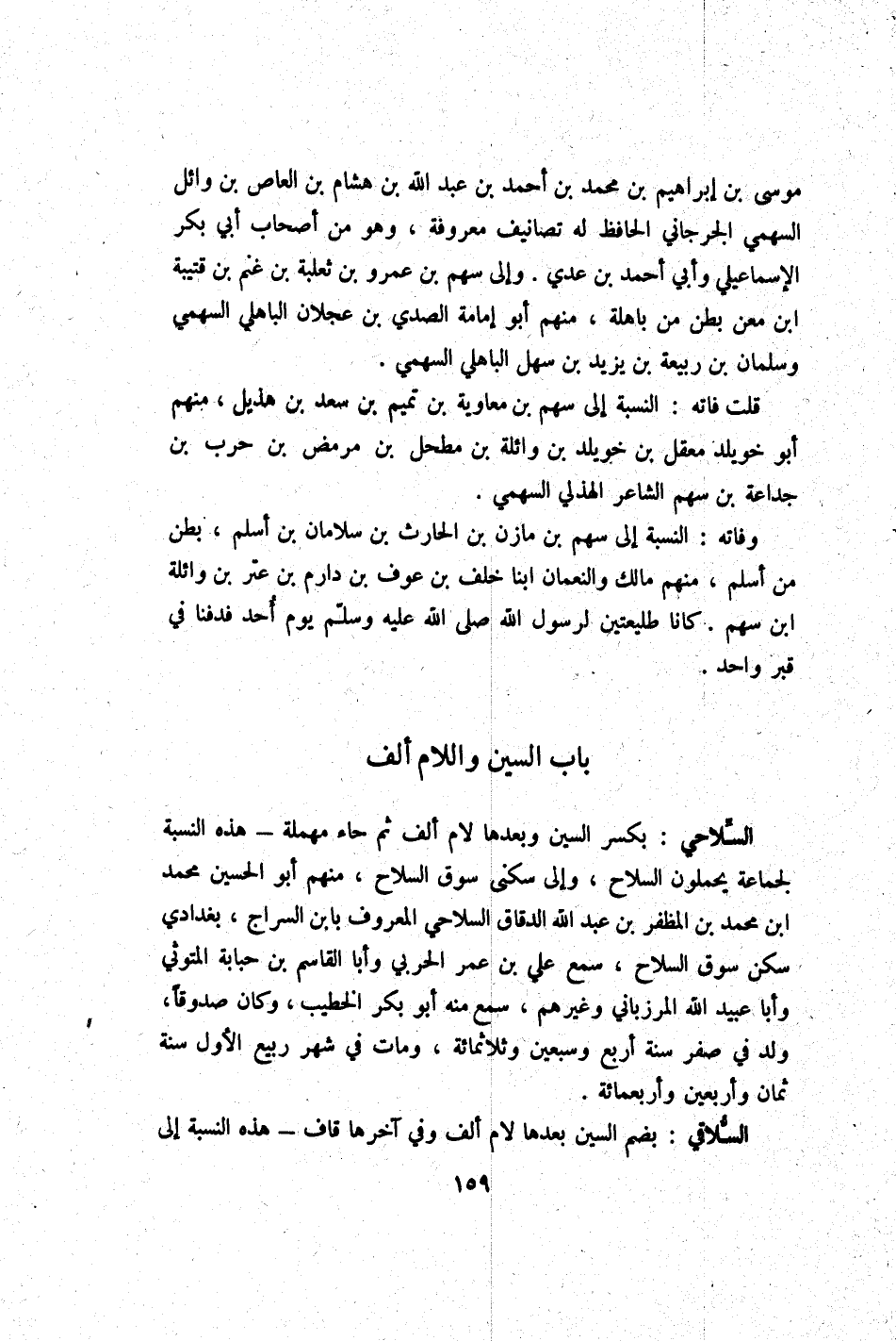 مُوسَى بن إِبْرَاهِيم بن مُحَمَّد بن أَحْمد بن عبد الله بن هِشَام بن الْعَاصِ بن وَائِل السَّهْمِي الْجِرْجَانِيّ الْحَافِظ لَهُ تصانيف مَعْرُوفَة وَهُوَ من أَصْحَاب أبي بكر الْإِسْمَاعِيلِيّ وَأبي أَحْمد بن عدي وَإِلَى سهم بن عَمْرو بن ثَعْلَبَة بن غنم بن قُتَيْبَة ابْن معن بطن من باهلة مِنْهُم أَبُو إِمَامَة الصدي بن عجلَان الْبَاهِلِيّ السَّهْمِي وسلمان بن ربيعَة بن يزِيد بن سهل الْبَاهِلِيّ السَّهْمِي