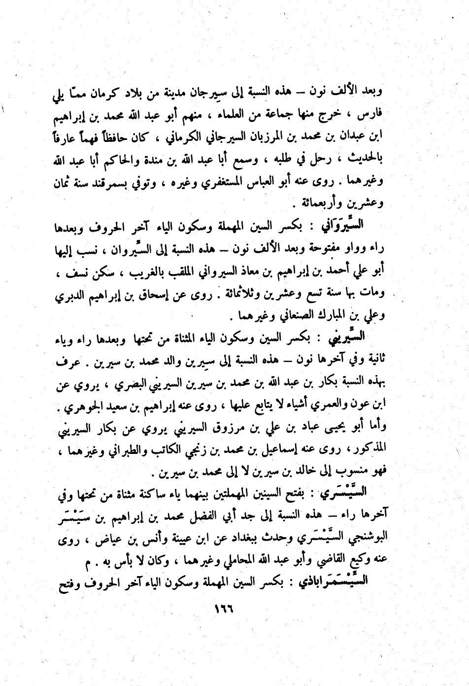 وَبعد الْألف نون - هَذِه النِّسْبَة إِلَى سيرجان مَدِينَة من بِلَاد كرمان مِمَّا يَلِي فَارس خرج مِنْهَا جمَاعَة من الْعلمَاء مِنْهُم أَبُو عبد الله مُحَمَّد بن إِبْرَاهِيم ابْن عَبْدَانِ بن مُحَمَّد بن الْمَرْزُبَان السيرجاني الْكرْمَانِي كَانَ حَافِظًا فهما عَارِفًا بِالْحَدِيثِ رَحل فِي طلبه وَسمع أَبَا عبد الله بن مندة وَالْحَاكِم أَبَا عبد الله وَغَيرهمَا روى عَنهُ أَبُو الْعَبَّاس المستغفري وَغَيره وَتُوفِّي بسمرقند سنة ثَمَان وَعشْرين وَأَرْبَعمِائَة