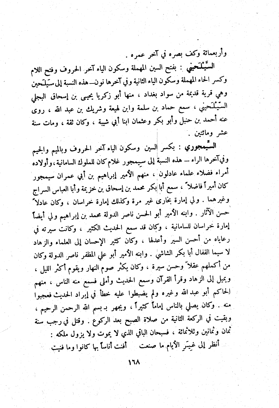 السيمجوري بِكَسْر السِّين وَسُكُون الْيَاء آخر الْحُرُوف وبالميم وَالْجِيم وَفِي آخرهَا الرَّاء - هَذِه النِّسْبَة إِلَى سيمجور غُلَام كَانَ للملوك السامانية وَأَوْلَاده أُمَرَاء فضلاء عُلَمَاء عادلون مِنْهُم الْأَمِير إِبْرَاهِيم بن أبي عمرَان سيمجور كَانَ أَمِيرا فَاضلا سمع أَبَا بكر مُحَمَّد بن إِسْحَاق بن خُزَيْمَة وَأَبا الْعَبَّاس السراج وَغَيرهمَا ولي إِمَارَة بُخَارى غير مرّة وَكَذَلِكَ إِمَارَة خُرَاسَان وَكَانَ عادلا حسن الْآثَار وَابْنه الْأَمِير أَبُو الْحسن نَاصِر الدولة مُحَمَّد بن إِبْرَاهِيم ولي أَيْضا إِمَارَة خُرَاسَان للسامانية وَكَانَ قد سمع الحَدِيث الْكثير وَكَانَت سيرته فِي رعاياه من أحسن السّير وأعدلها وَكَانَ كثير الْإِحْسَان إِلَى الْعلمَاء والزهاد لَا سِيمَا الْقفال أَبَا بكر الشَّاشِي وَابْنه الْأَمِير أَبُو عَليّ المظفر نَاصِر الدولة وَكَانَ من أكملهم عقلا وَحسن سيرة وَكَانَ يكثر صَوْم النَّهَار وَيقوم أَكثر اللَّيْل ويميل إِلَى الزهاد وَقَرَأَ الْقُرْآن وَسمع الحَدِيث وأملى فَسمع مِنْهُ النَّاس مِنْهُم الْحَاكِم أَبُو عبد الله وَغَيره وَلم يضبطوا عَلَيْهِ خطأ فِي إِيرَاد الحَدِيث فعجبوا مِنْهُ وَكَانَ يُصَلِّي بِالنَّاسِ إِمَامًا كثيرا ويجهر بِبسْم الله الرَّحْمَن الرَّحِيم وَبقيت فِي الرَّكْعَة الثَّانِيَة من صَلَاة الصُّبْح بعد الرُّكُوع وَقتل فِي رَجَب سنة ثَمَان وَثَمَانِينَ وثلاثمائة فسبحان الْبَاقِي الَّذِي لَا يَمُوت وَلَا يَزُول ملكه
