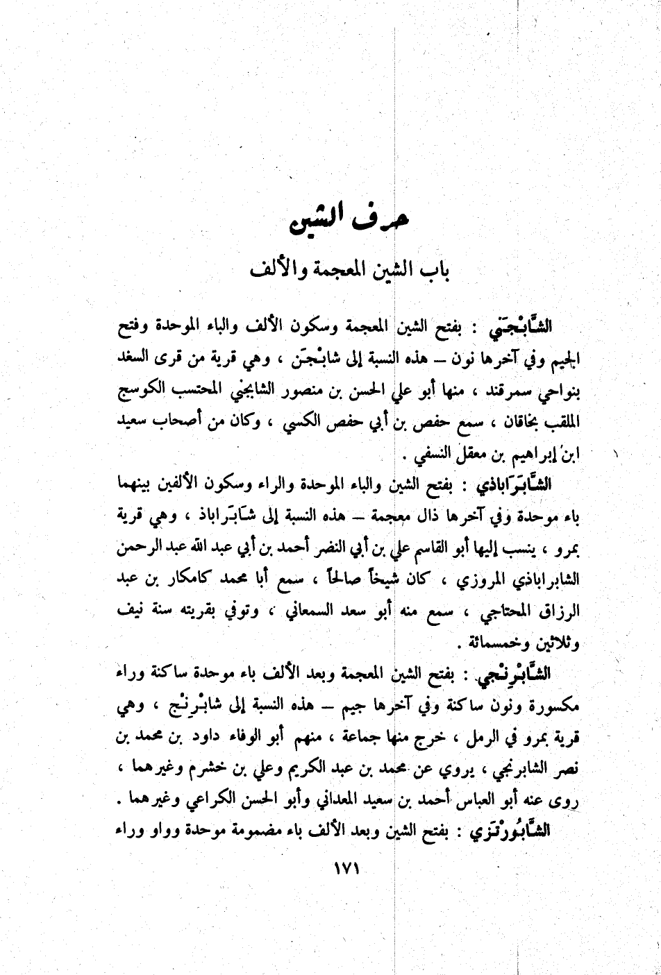 الشابجني بِفَتْح الشين الْمُعْجَمَة وَسُكُون الْألف وَالْبَاء الْمُوَحدَة وَفتح الْجِيم وَفِي آخرهَا نون - هَذِه النِّسْبَة إِلَى شابجن وَهِي قَرْيَة من قرى السغد بنواحي سَمَرْقَنْد مِنْهَا أَبُو عَليّ الْحسن بن مَنْصُور الشابجني الْمُحْتَسب الكوسج الملقب بخاقان سمع حَفْص بن أبي حَفْص الكسي وَكَانَ من أَصْحَاب سعيد ابْن إِبْرَاهِيم بن معقل النَّسَفِيّ