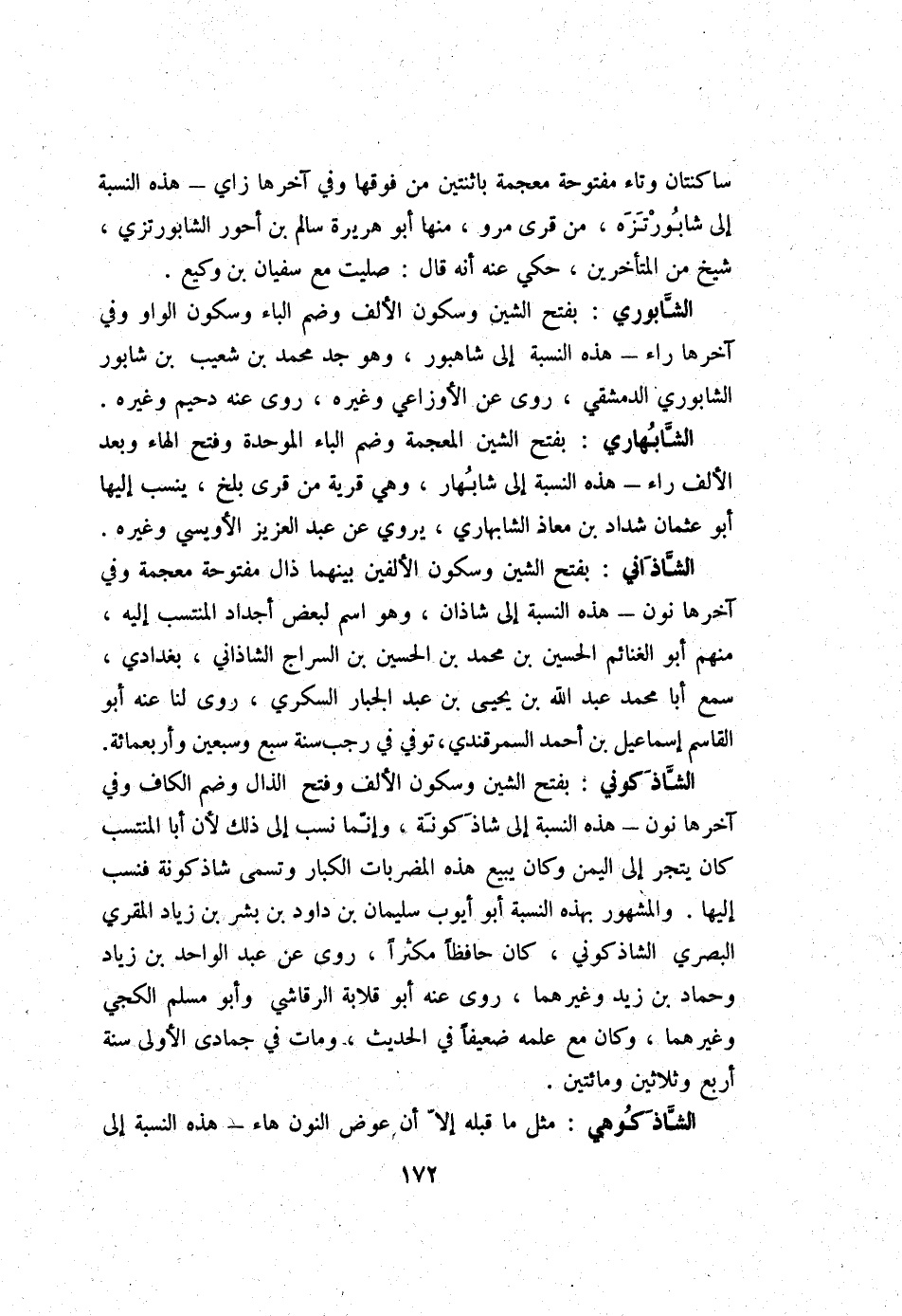 الشاذاني بِفَتْح الشين وَسُكُون الْأَلفَيْنِ بَينهمَا ذال مَفْتُوحَة مُعْجمَة وَفِي آخرهَا نون - هَذِه النِّسْبَة إِلَى شَاذان وَهُوَ اسْم لبَعض أجداد المنتسب إِلَيْهِ مِنْهُم أَبُو الْغَنَائِم الْحُسَيْن بن مُحَمَّد بن الْحُسَيْن بن السراج الشاذاني بغدادي سمع أَبَا مُحَمَّد عبد الله بن يحيى بن عبد الْجَبَّار السكرِي روى لنا عَنهُ أَبُو الْقَاسِم إِسْمَاعِيل بن أَحْمد السَّمرقَنْدِي توفّي فِي رَجَب سنة سبع وَسبعين وَأَرْبَعمِائَة