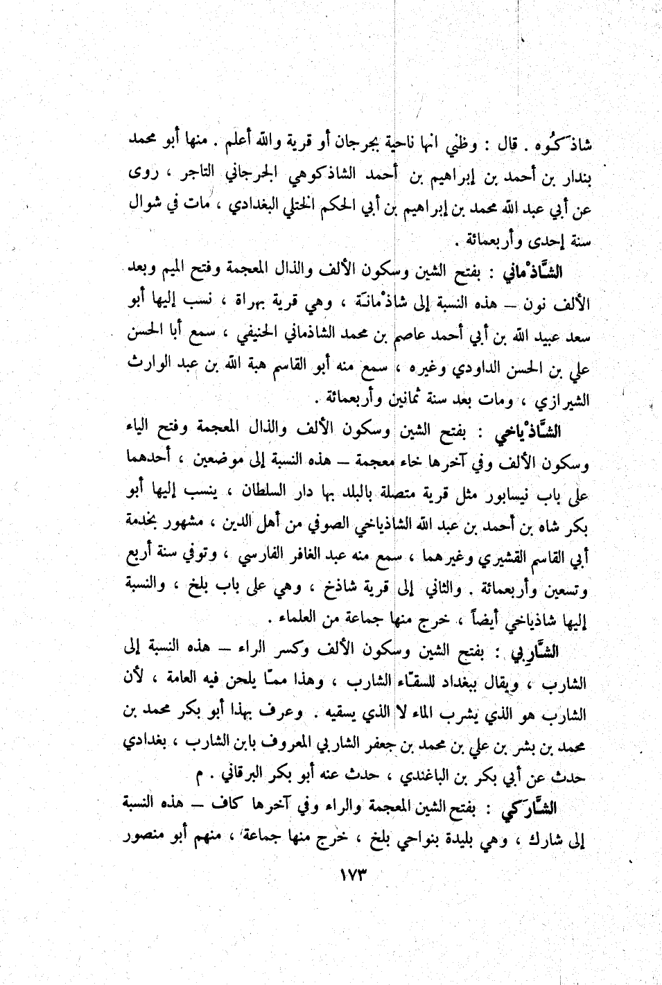 الشاذياخي بِفَتْح الشين وَسُكُون الْألف والذال الْمُعْجَمَة وَفتح الْيَاء وَسُكُون الْألف وَفِي آخرهَا خاء مُعْجمَة - هَذِه النِّسْبَة إِلَى موضِعين أَحدهمَا على بَاب نيسابور مثل قَرْيَة مُتَّصِلَة بِالْبَلَدِ بهَا دَار السُّلْطَان ينْسب إِلَيْهَا أَبُو بكر شاه بن أَحْمد بن عبد الله الشاذياخي الصُّوفِي من أهل الدّين مَشْهُور بِخِدْمَة أبي الْقَاسِم الْقشيرِي وَغَيرهمَا سمع مِنْهُ عبد الغافر الْفَارِسِي وَتُوفِّي سنة أَربع وَتِسْعين وَأَرْبَعمِائَة وَالثَّانِي إِلَى قَرْيَة شاذخ وَهِي على بَاب بَلخ وَالنِّسْبَة إِلَيْهَا شاذياخي أَيْضا خرج مِنْهَا جمَاعَة من الْعلمَاء