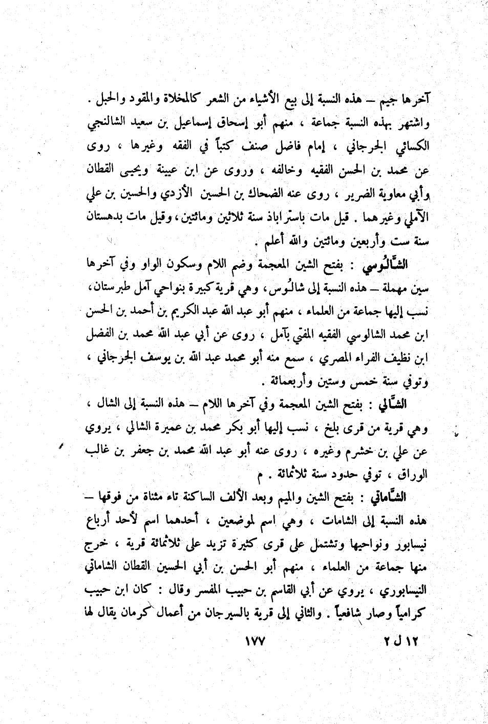 آخرهَا جِيم - هَذِه النِّسْبَة إِلَى بيع الْأَشْيَاء من الشّعْر كالمخلاة والمقود وَالْحَبل واشتهر بِهَذِهِ النِّسْبَة جمَاعَة مِنْهُم أَبُو إِسْحَاق إِسْمَاعِيل بن سعيد الشالنجي الْكسَائي الْجِرْجَانِيّ إِمَام فَاضل صنف كتبا فِي الْفِقْه وَغَيرهَا روى عَن مُحَمَّد بن الْحسن الْفَقِيه وَخَالفهُ وروى عَن ابْن عُيَيْنَة وَيحيى الْقطَّان وَأبي مُعَاوِيَة الضَّرِير روى عَنهُ الضَّحَّاك بن الْحُسَيْن الْأَزْدِيّ وَالْحُسَيْن بن عَليّ الآملي وَغَيرهمَا قيل مَاتَ باستراباذ سنة ثَلَاثِينَ وَمِائَتَيْنِ وَقيل مَاتَ بدهستان سنة سِتّ وَأَرْبَعين وَمِائَتَيْنِ وَالله أعلم
