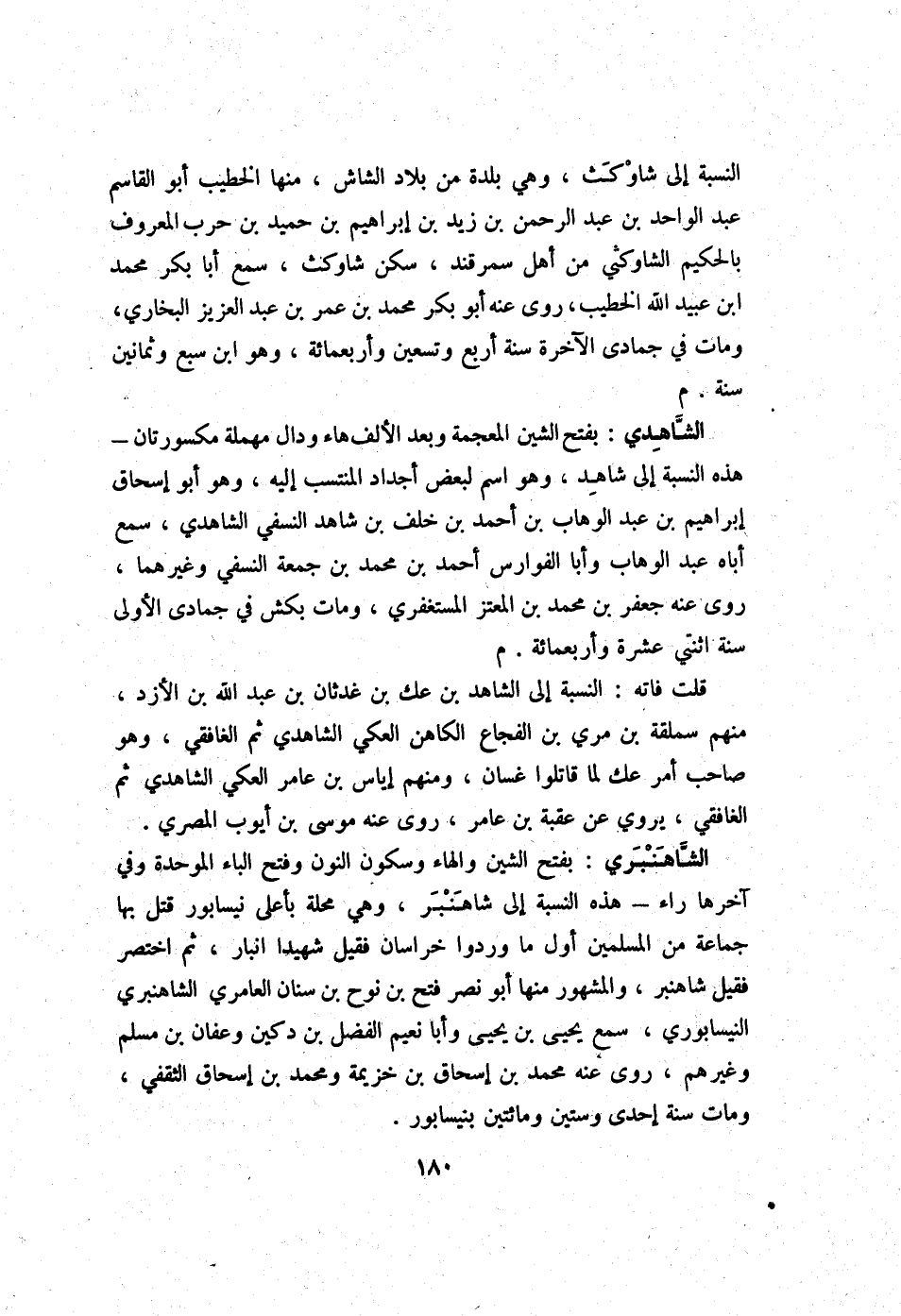 الشاهدي بِفَتْح الشين الْمُعْجَمَة وَبعد الْألف هَاء ودال مُهْملَة مكسورتان - هَذِه النِّسْبَة إِلَى شَاهد وَهُوَ اسْم لبَعض أجداد المنتسب إِلَيْهِ وَهُوَ أَبُو إِسْحَاق إِبْرَاهِيم بن عبد الْوَهَّاب بن أَحْمد بن خلف بن شَاهد النَّسَفِيّ الشاهدي سمع أَبَاهُ عبد الْوَهَّاب وَأَبا الفوارس أَحْمد بن مُحَمَّد بن جُمُعَة النَّسَفِيّ وَغَيرهمَا روى عَنهُ جَعْفَر بن مُحَمَّد بن المعتز المستغفري وَمَات بكش فِي جُمَادَى الأولى سنة اثْنَتَيْ عشرَة وَأَرْبَعمِائَة م