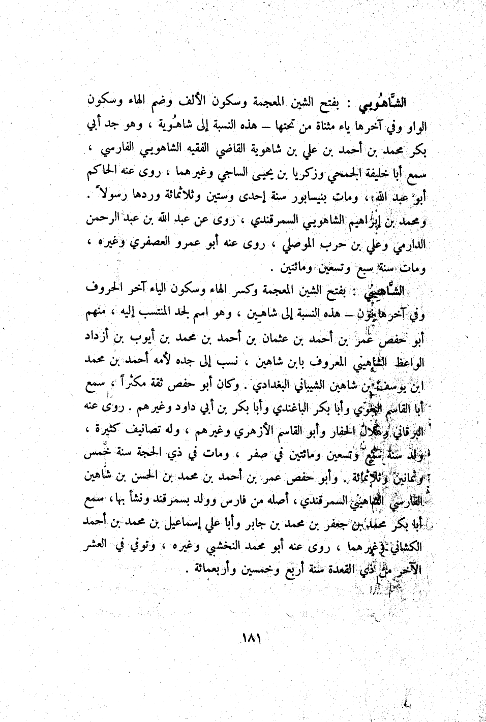 الشاهيني بِفَتْح الشين الْمُعْجَمَة وَكسر الْهَاء وَسُكُون الْيَاء آخر الْحُرُوف وَفِي آخرهَا نون - هَذِه النِّسْبَة إِلَى شاهين وَهُوَ اسْم لجد المنتسب إِلَيْهِ مِنْهُم أَبُو حَفْص عمر بن أَحْمد بن عُثْمَان بن أَحْمد بن مُحَمَّد بن أَيُّوب بن أزداد الْوَاعِظ الشاهيني الْمَعْرُوف بِابْن شاهين نسب إِلَى جده لأمه أَحْمد بن مُحَمَّد ابْن يُوسُف بن شاهين الشَّيْبَانِيّ الْبَغْدَادِيّ وَكَانَ أَبُو حَفْص ثِقَة مكثرا سمع أَبَا الْقَاسِم الْبَغَوِيّ وَأَبا بكر الباغندي وَأَبا بكر بن أبي دَاوُد وَغَيرهم روى عَنهُ البرقاني وهلال الحفار وَأَبُو الْقَاسِم الْأَزْهَرِي وَغَيرهم وَله تصانيف كَثِيرَة ولد سنة سبع وَتِسْعين وَمِائَتَيْنِ فِي صفر وَمَات فِي ذِي الْحجَّة سنة خمس وَثَمَانِينَ وثلاثمائة وَأَبُو حَفْص عمر بن أَحْمد بن مُحَمَّد بن الْحسن بن شاهين الْفَارِسِي الشاهيني السَّمرقَنْدِي أَصله من فَارس وَولد بسمرقند وَنَشَأ بهَا سمع أَبَا بكر مُحَمَّد بن جَعْفَر بن مُحَمَّد بن جَابر وَأَبا عَليّ إِسْمَاعِيل بن مُحَمَّد بن أَحْمد الكشاني وَغَيرهمَا روى عَنهُ أَبُو مُحَمَّد النخشبي وَغَيره وَتُوفِّي فِي الْعشْر الآخر من ذِي الْقعدَة سنة أَربع وَخمسين وَأَرْبَعمِائَة