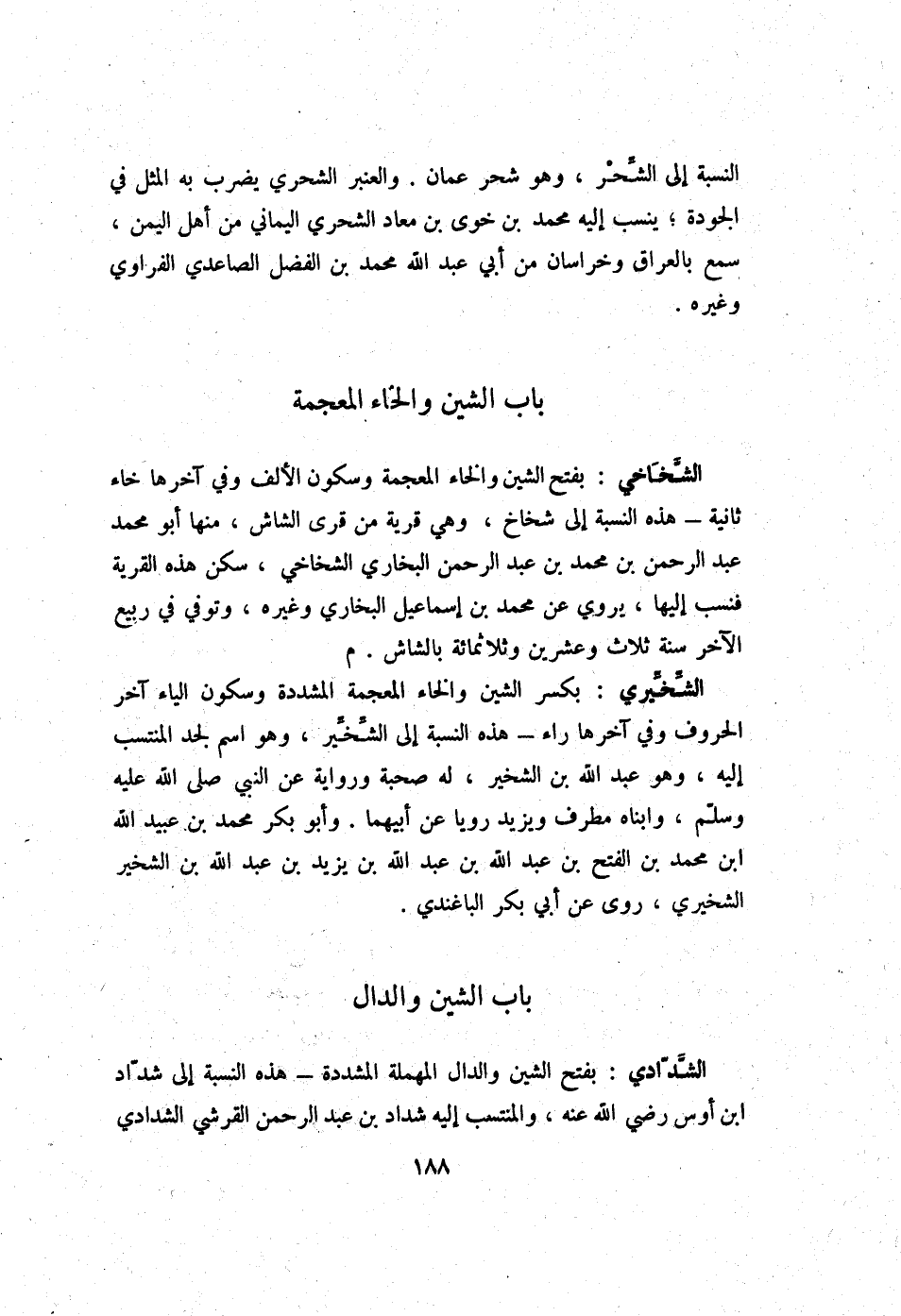 الشدادي بِفَتْح الشين وَالدَّال الْمُهْملَة الْمُشَدّدَة - هَذِه النِّسْبَة إِلَى شَدَّاد ابْن أَوْس رَضِي الله عَنهُ والمنتسب إِلَيْهِ شَدَّاد بن عبد الرَّحْمَن الْقرشِي الشدادي