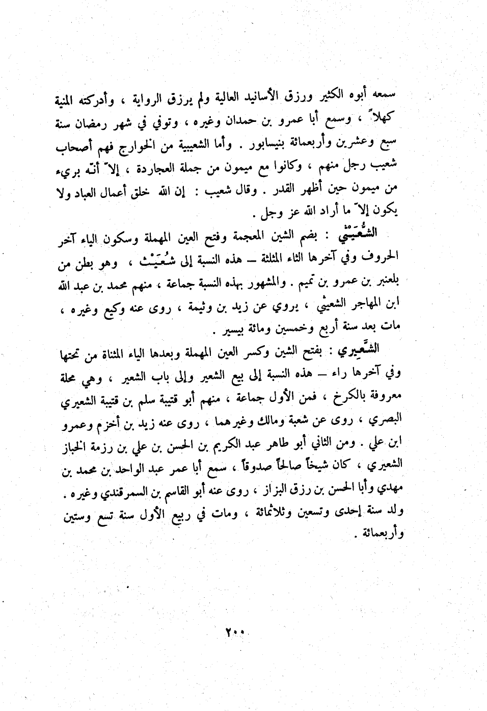 سَمعه أَبوهُ الْكثير ورزق الْأَسَانِيد الْعَالِيَة وَلم يرْزق الرِّوَايَة وأدركته الْمنية كهلا وَسمع ابا عَمْرو بن حمدَان وَغَيره وَتُوفِّي فِي شهر رَمَضَان سنة سبع وَعشْرين وَأَرْبَعمِائَة بنيسابور وَأما الشعيبية من الْخَوَارِج فهم أَصْحَاب شُعَيْب رجل مِنْهُم وَكَانُوا مَعَ مَيْمُون من جملَة العجاردة إِلَّا أَنه بَرِيء من مَيْمُون حِين أظهر الْقدر وَقَالَ شُعَيْب إِن الله خلق أَعمال الْعباد وَلَا يكون إِلَّا مَا أَرَادَ الله عز وَجل