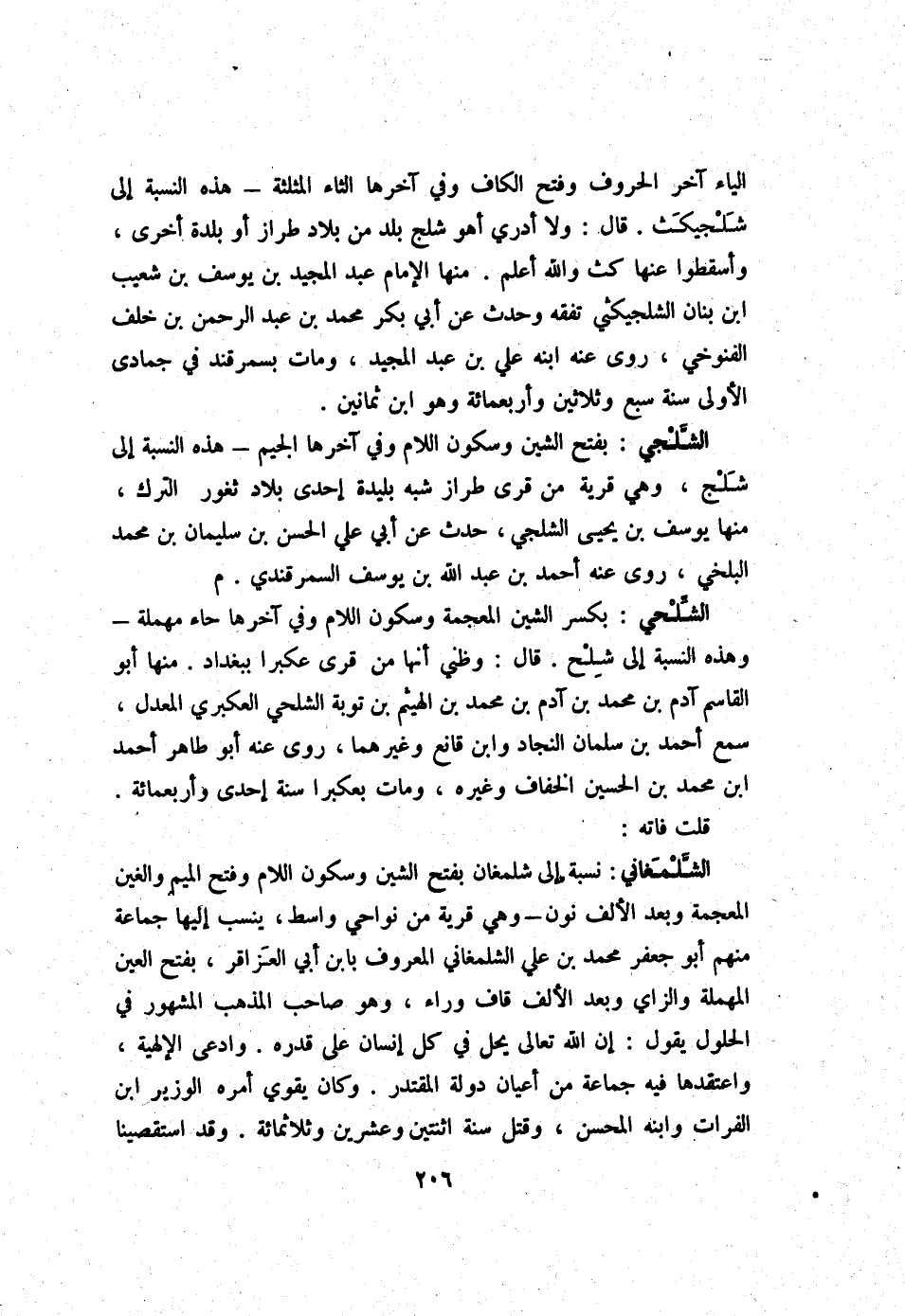 قلت فَاتَهُ الشلمغاني نِسْبَة إِلَى شلمغان بِفَتْح الشين وَسُكُون اللَّام وَفتح الْمِيم والغين الْمُعْجَمَة وَبعد الْألف نون - وَهِي قَرْيَة من نواحي وَاسِط ينْسب إِلَيْهَا جمَاعَة مِنْهُم أَبُو جَعْفَر مُحَمَّد بن عَليّ الشلمغاني الْمَعْرُوف بِابْن أبي العزاقر بِفَتْح الْعين الْمُهْملَة وَالزَّاي وَبعد الْألف قَاف وَرَاء وَهُوَ صَاحب الْمَذْهَب الْمَشْهُور فِي الْحُلُول يَقُول إِن الله تَعَالَى يحل فِي كل إِنْسَان على قدره وَادّعى الإلهية واعتقدها فِيهِ جمَاعَة من أَعْيَان دولة المقتدر وَكَانَ يُقَوي أمره الْوَزير ابْن الْفُرَات وَابْنه المحسن وَقتل سنة اثْنَتَيْنِ وَعشْرين وثلاثمائة وَقد استقصينا