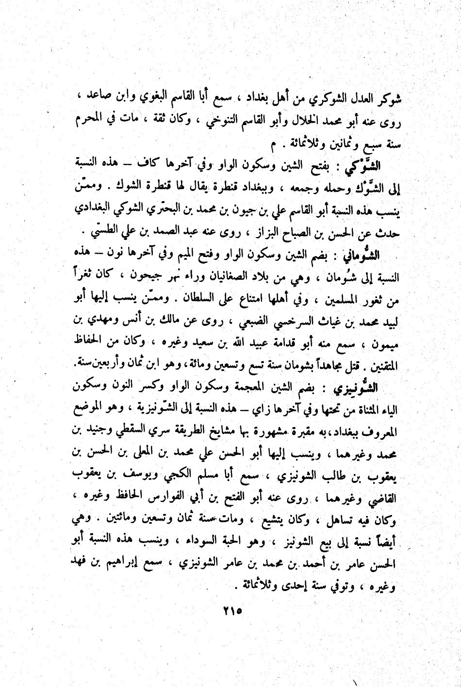 الشونيزي بِضَم الشين الْمُعْجَمَة وَسُكُون الْوَاو وَكسر النُّون وَسُكُون الْيَاء الْمُثَنَّاة من تحتهَا وَفِي آخرهَا زَاي - هَذِه النِّسْبَة إِلَى الشونيزية وَهُوَ الْموضع الْمَعْرُوف بِبَغْدَاد بِهِ مَقْبرَة مَشْهُورَة بهَا مَشَايِخ الطَّرِيقَة سري السَّقطِي وجنيد بن مُحَمَّد وَغَيرهمَا وينسب إِلَيْهَا أَبُو الْحسن عَليّ مُحَمَّد بن الْمُعَلَّى بن الْحسن بن يَعْقُوب بن طَالب الشونيزي سمع أَبَا مُسلم الْكَجِّي ويوسف بن يَعْقُوب القَاضِي وَغَيرهمَا روى عَنهُ أَبُو الْفَتْح بن أبي الفوارس الْحَافِظ وَغَيره وَكَانَ فِيهِ تساهل وَكَانَ يتشيع وَمَات سنة ثَمَان وَتِسْعين وَمِائَتَيْنِ وَهِي أَيْضا نِسْبَة إِلَى بيع الشونيز وَهُوَ الْحبَّة السَّوْدَاء وينسب هَذِه النِّسْبَة أَبُو الْحسن عَامر بن أَحْمد بن مُحَمَّد بن عَامر الشونيزي سمع إِبْرَاهِيم بن فَهد وَغَيره وَتُوفِّي سنة إِحْدَى وثلاثمائة