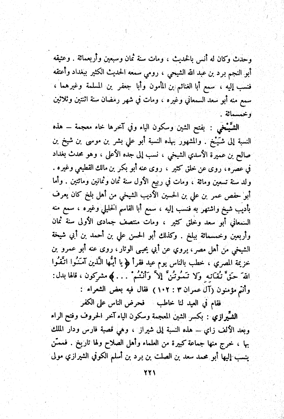الشيخي بِفَتْح الشين وَسُكُون الْيَاء وَفِي آخرهَا خاء مُعْجمَة - هَذِه النِّسْبَة إِلَى شيخ وَالْمَشْهُور بِهَذِهِ النِّسْبَة أَبُو عَليّ بشر بن مُوسَى بن شيخ بن صَالح بن عميرَة الْأَسدي الشيخي نسب إِلَى جده الْأَعْلَى وَهُوَ مُحدث بَغْدَاد فِي عصره روى عَن خلق كثير روى عَنهُ أَبُو بكر بن مَالك الْقطيعِي وَغَيره ولد سنة تسعين وَمِائَة وَمَات فِي ربيع الأول سنة ثَمَان وَثَمَانِينَ وَمِائَتَيْنِ وَأما أَبُو حَفْص عمر بن عَليّ بن الْحُسَيْن الأديب الشيخي من أهل بَلخ كَانَ يعرف بأديب شيخ واشتهر بِهِ فنسب إِلَيْهِ سمع أَبَا الْقَاسِم الخليلي وَغَيره سمع مِنْهُ السَّمْعَانِيّ أَبُو سعد وَخلق كثير وَمَات منتصف جُمَادَى الأولى سنة ثَمَان وَأَرْبَعين وَخَمْسمِائة ببلخ وَكَذَلِكَ أَبُو الْحسن عَليّ بن أَحْمد بن أبي شيخة الشيخي من أهل مصر يروي عَن أبي يحيى الوتار روى عَنهُ أَبُو عَمْرو بن خُزَيْمَة الْمصْرِيّ خطب بِالنَّاسِ يَوْم عيد فَقَرَأَ {يَا أَيهَا الَّذين آمنُوا اتَّقوا الله حق تُقَاته وَلَا تموتن إِلَّا وَأَنْتُم} مشركون قَالَهَا بدل وَأَنْتُم مُؤمنُونَ آل عمرَان 3: 102 فَقَالَ فِيهِ بعض الشُّعَرَاء