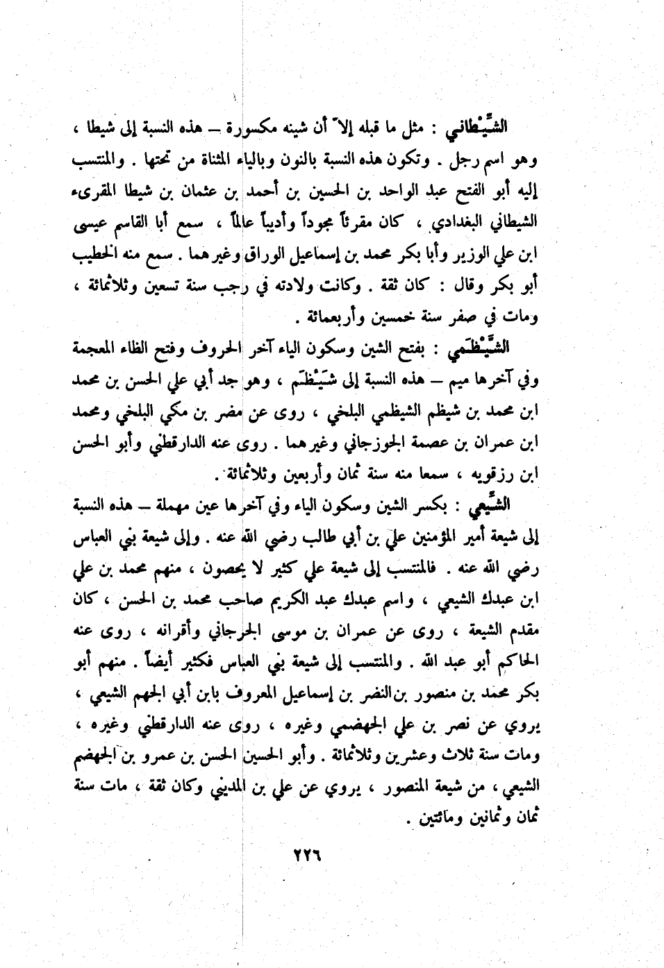 الشيطاني مثل مَا قبله إِلَّا أَن شينه مَكْسُورَة - هَذِه النِّسْبَة إِلَى شيطا وَهُوَ اسْم رجل وَتَكون هَذِه النِّسْبَة بالنُّون وبالياء الْمُثَنَّاة من تحتهَا والمنتسب إِلَيْهِ أَبُو الْفَتْح عبد الْوَاحِد بن الْحُسَيْن بن أَحْمد بن عُثْمَان بن شيطا المقرىء الشيطاني الْبَغْدَادِيّ كَانَ مقرئا مجودا وأديبا عَالما سمع أَبَا الْقَاسِم عِيسَى ابْن عَليّ الْوَزير وَأَبا بكر مُحَمَّد بن إِسْمَاعِيل الْوراق وَغَيرهمَا سمع مِنْهُ الْخَطِيب أَبُو بكر وَقَالَ كَانَ ثِقَة وَكَانَت وِلَادَته فِي رَجَب سنة تسعين وثلاثمائة وَمَات فِي صفر سنة خمسين وَأَرْبَعمِائَة