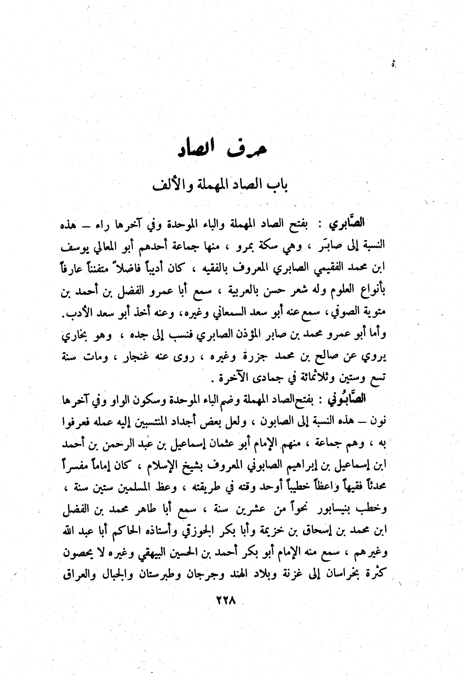 الصَّابُونِي بِفَتْح الصَّاد الْمُهْملَة وَضم الْبَاء الْمُوَحدَة وَسُكُون الْوَاو وَفِي آخرهَا نون - هَذِه النِّسْبَة إِلَى الصابون وَلَعَلَّ بعض أجداد المنتسبين إِلَيْهِ عمله فعرفوا بِهِ وهم جمَاعَة مِنْهُم الإِمَام أَبُو عُثْمَان إِسْمَاعِيل بن عبد الرَّحْمَن بن أَحْمد ابْن إِسْمَاعِيل بن إِبْرَاهِيم الصَّابُونِي الْمَعْرُوف بشيخ الْإِسْلَام كَانَ إِمَامًا مُفَسرًا مُحدثا فَقِيها واعظا خَطِيبًا أوحد وقته فِي طَرِيقَته وعظ الْمُسلمين سِتِّينَ سنة وخطب بنيسابور نَحوا من عشْرين سنة سمع أَبَا طَاهِر مُحَمَّد بن الْفضل ابْن مُحَمَّد بن إِسْحَاق بن خُزَيْمَة وَأَبا بكر الجوزقي وأستاذه الْحَاكِم أَبَا عبد الله وَغَيرهم سمع مِنْهُ الإِمَام أَبُو بكر أَحْمد بن الْحُسَيْن الْبَيْهَقِيّ وَغَيره لَا يُحصونَ كَثْرَة بخراسان إِلَى غزنة وبلاد الْهِنْد وجرجان وطبرستان وَالْجِبَال وَالْعراق