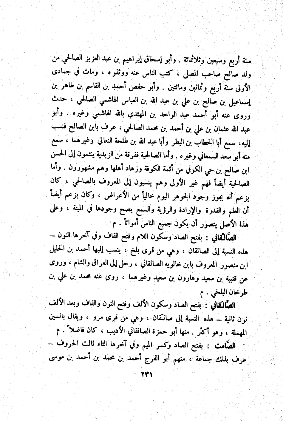 سنة أَربع وَسبعين وثلاثمائة وَأَبُو إِسْحَاق إِبْرَاهِيم بن عبد الْعَزِيز الصَّالِحِي من ولد صَالح صَاحب الْمصلى كتب النَّاس عَنهُ ووثقوه وَمَات فِي جُمَادَى الأولى سنة أَربع وَثَمَانِينَ وَمِائَتَيْنِ وَأَبُو حَفْص أَحْمد بن الْقَاسِم بن طَاهِر بن إِسْمَاعِيل بن صَالح بن عَليّ بن عبد الله بن الْعَبَّاس الْهَاشِمِي الصَّالِحِي حدث وروى عَنهُ أَبُو أَحْمد عبد الْوَاحِد بن الْمُهْتَدي بِاللَّه الْهَاشِمِي وَغَيره وَأَبُو عبد الله عُثْمَان بن عَليّ بن أَحْمد بن مُحَمَّد الصَّالِحِي عرف بِابْن الصَّالح فنسب إِلَيْهِ سمع أَبَا الْخطاب بن البطر وَأَبا عبد الله بن طَلْحَة النعالي وغيرهماسمع مِنْهُ أَبُو سعد السَّمْعَانِيّ وَغَيره وَأما الصالحية ففرقة من الزيدية ينتمون إِلَى الْحسن بن صَالح بن حَيّ الْكُوفِي من أَئِمَّة الْكُوفَة وزهاد أَهلهَا وهم مَشْهُورُونَ وَأما الصالحية أَيْضا فهم غير الأولى وهم ينسبون إِلَى الْمَعْرُوف بالصالحي كَانَ يزْعم أَنه يجوز وجود الْجَوْهَر الْيَوْم خَالِيا من الْأَعْرَاض وَكَانَ يزْعم أَيْضا أَن الْعلم وَالْقُدْرَة والإرادة والرؤية والسمع يَصح وجودهَا فِي الْميتَة وعَلى هَذَا الأَصْل يتَصَوَّر أَن يكون جَمِيع النَّاس أَمْوَاتًا م