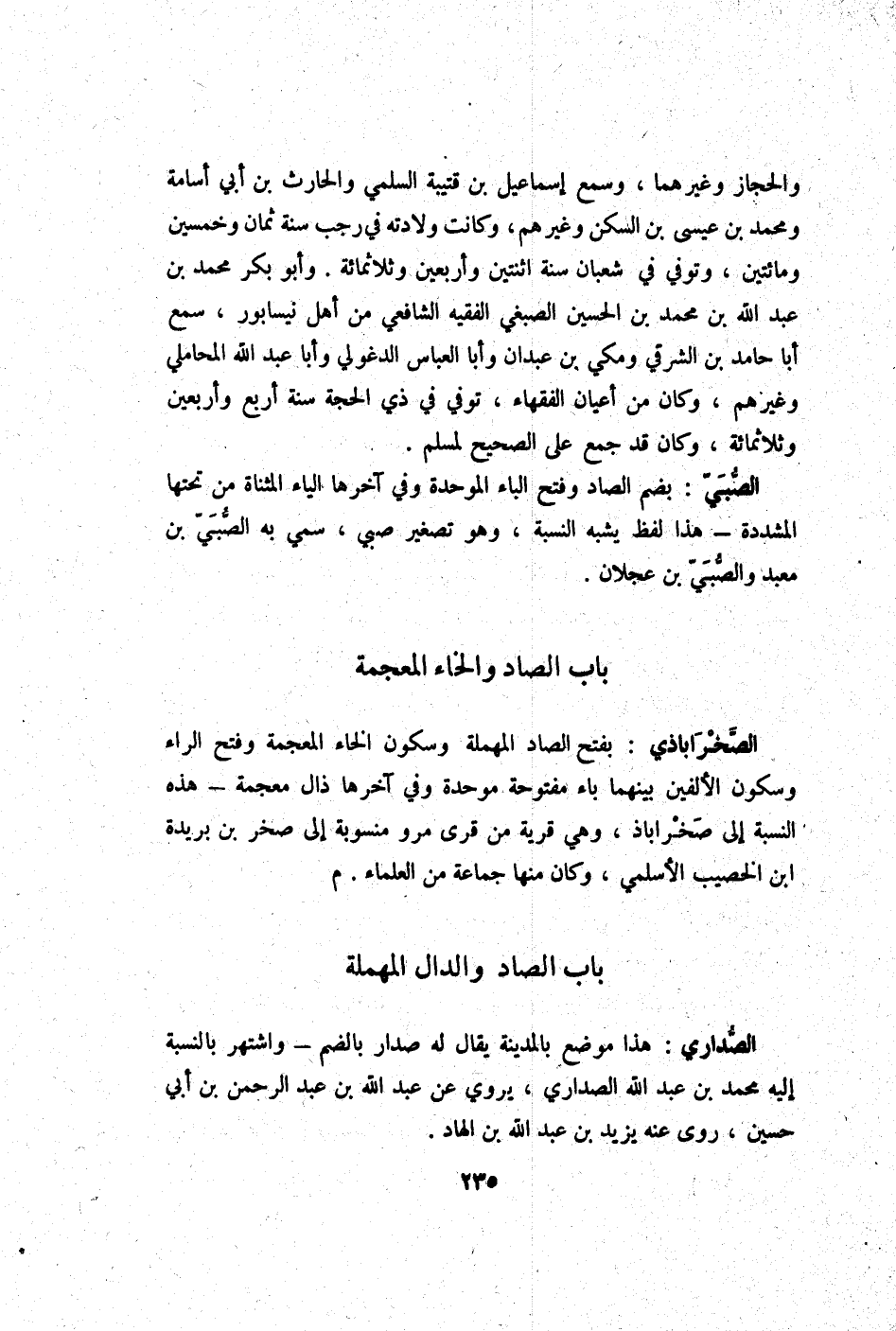 والحجاز وَغَيرهمَا وَسمع إِسْمَاعِيل بن قُتَيْبَة السّلمِيّ والْحَارث بن أبي أُسَامَة وَمُحَمّد بن عِيسَى بن السكن وَغَيرهم وَكَانَت وِلَادَته فِي رَجَب سنة ثَمَان وَخمسين وَمِائَتَيْنِ وَتُوفِّي فِي شعْبَان سنة اثْنَتَيْنِ وَأَرْبَعين وثلاثمائة وَأَبُو بكر مُحَمَّد بن عبد الله بن مُحَمَّد بن الْحُسَيْن الصبغي الْفَقِيه الشَّافِعِي من أهل نيسابور سمع أَبَا حَامِد بن الشَّرْقِي ومكي بن عَبْدَانِ وَأَبا الْعَبَّاس الدغولي وَأَبا عبد الله الْمحَامِلِي وَغَيرهم وَكَانَ من أَعْيَان الْفُقَهَاء توفّي فِي ذِي الْحجَّة سنة أَربع وَأَرْبَعين وثلاثمائة وَكَانَ قد جمع على الصَّحِيح لمُسلم