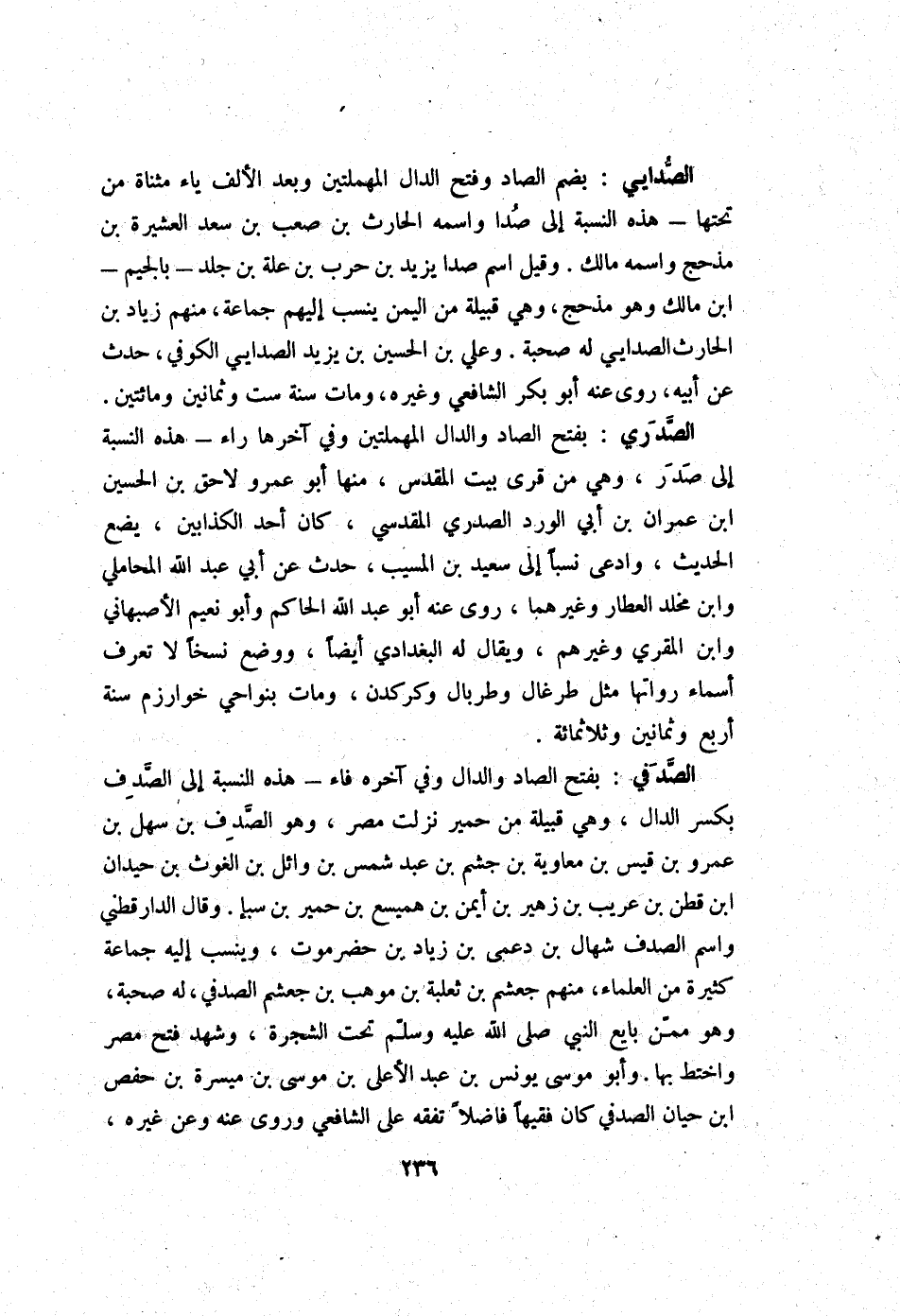 الصدايي بِضَم الصَّاد وَفتح الدَّال الْمُهْمَلَتَيْنِ وَبعد الْألف يَاء مثناة من تحتهَا - هَذِه النِّسْبَة إِلَى صدا واسْمه الْحَارِث بن صَعب بن سعد الْعَشِيرَة بن مذْحج واسْمه مَالك وَقيل اسْم صدا يزِيد بن حَرْب بن عِلّة بن جلد - بِالْجِيم - ابْن مَالك وَهُوَ مذْحج وَهِي قَبيلَة من الْيمن ينْسب إِلَيْهِم جمَاعَة مِنْهُم زِيَاد بن الْحَارِث الصدايي لَهُ صُحْبَة وَعلي بن الْحُسَيْن بن يزِيد الصدايي الْكُوفِي حدث عَن أَبِيه روى عَنهُ أَبُو بكر الشَّافِعِي وَغَيره وَمَات سنة سِتّ وَثَمَانِينَ وَمِائَتَيْنِ
