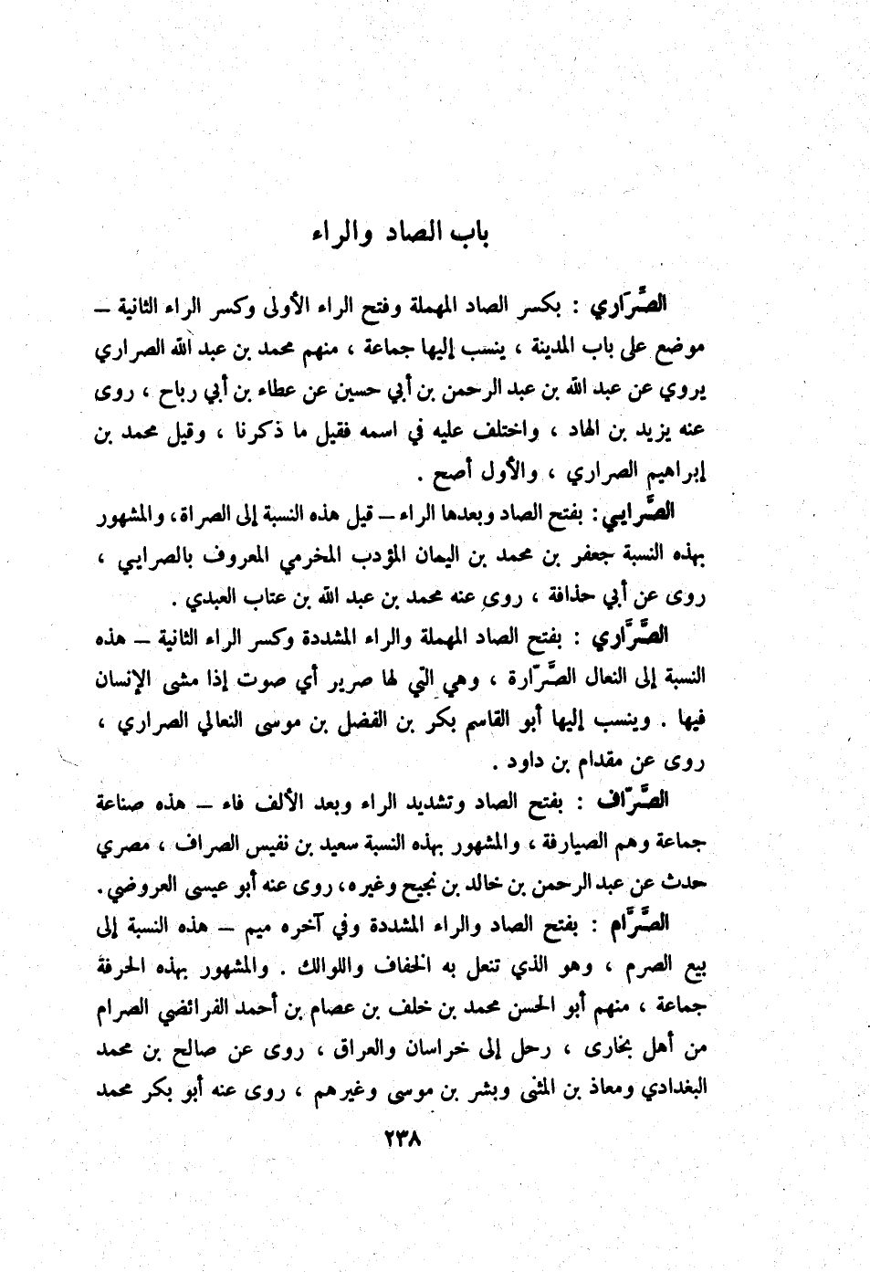 الصراري بِفَتْح الصَّاد المهلمة وَالرَّاء الْمُشَدّدَة وَكسر الرَّاء الثَّانِيَة - هَذِه النِّسْبَة إِلَى النِّعَال الصرارة وَهِي الَّتِي لَهَا صرير أَي صَوت إِذا مَشى الْإِنْسَان فِيهَا وينسب إِلَيْهَا أَبُو الْقَاسِم بكر بن الْفضل بن مُوسَى النعالي الصراري روى عَن مِقْدَام بن دَاوُد