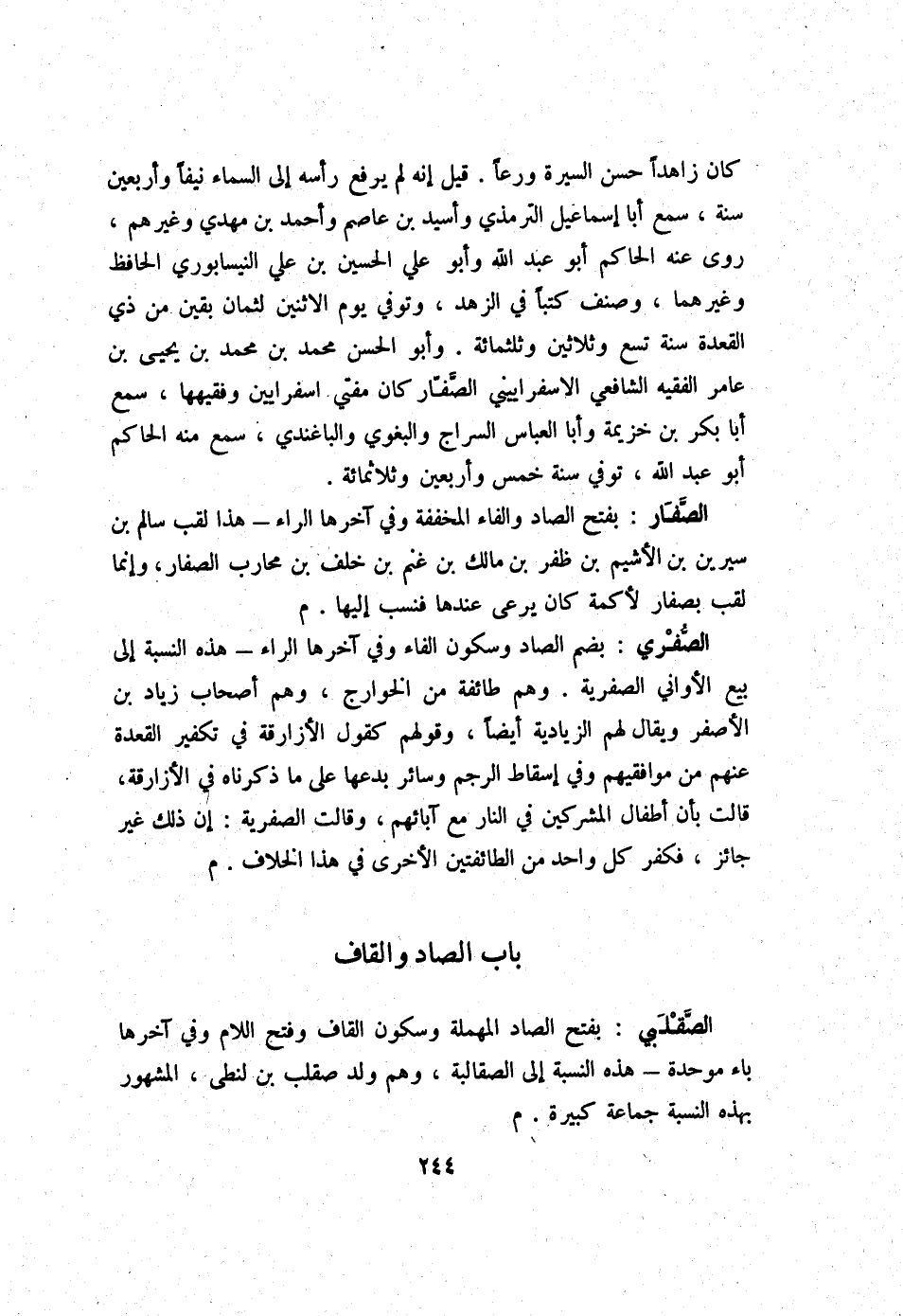 الصفري بِضَم الصَّاد وَسُكُون الْفَاء وَفِي آخرهَا الرَّاء - هَذِه النِّسْبَة إِلَى بيع الْأَوَانِي الصفرية وهم طَائِفَة من الْخَوَارِج وهم أَصْحَاب زِيَاد بن الْأَصْفَر وَيُقَال لَهُم الزيادية أَيْضا وَقَوْلهمْ كَقَوْل الْأزَارِقَة فِي تَكْفِير الْقعدَة عَنْهُم من موافقيهم وَفِي إِسْقَاط الرَّجْم وَسَائِر بدعها على مَا ذَكرْنَاهُ فِي الْأزَارِقَة قَالَت بِأَن أَطْفَال الْمُشْركين فِي النَّار مَعَ آبَائِهِم وَقَالَت الصفرية إِن ذَلِك غير جَائِز فَكفر كل وَاحِد من الطَّائِفَتَيْنِ الْأُخْرَى فِي هَذَا الْخلاف م