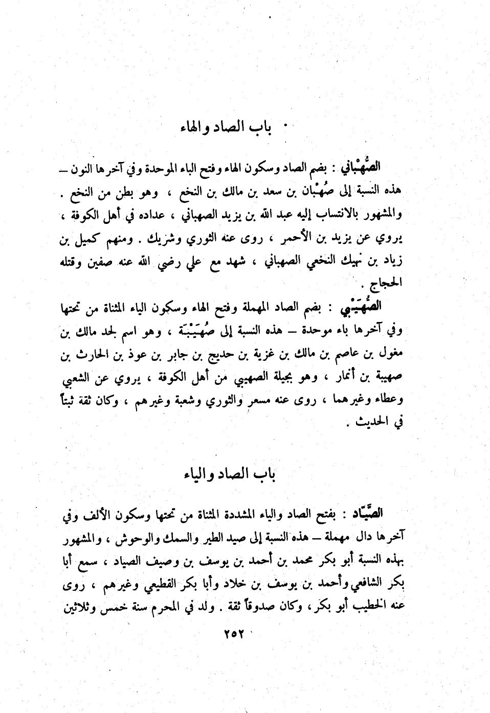 الصياد بِفَتْح الصَّاد وَالْيَاء الْمُشَدّدَة الْمُثَنَّاة من تحتهَا وَسُكُون الْألف وَفِي آخرهَا دَال مُهْملَة - هَذِه النِّسْبَة إِلَى صيد الطير والسمك والوحوش وَالْمَشْهُور بِهَذِهِ النِّسْبَة أَبُو بكر مُحَمَّد بن أَحْمد بن يُوسُف بن وصيف الصياد سمع أَبَا بكر الشَّافِعِي وَأحمد بن يُوسُف بن خَلاد وابا بكر الْقطيعِي وَغَيرهم روى عَنهُ الْخَطِيب أَبُو بكر وَكَانَ صَدُوقًا ثِقَة ولد فِي الْمحرم سنة خمس وَثَلَاثِينَ