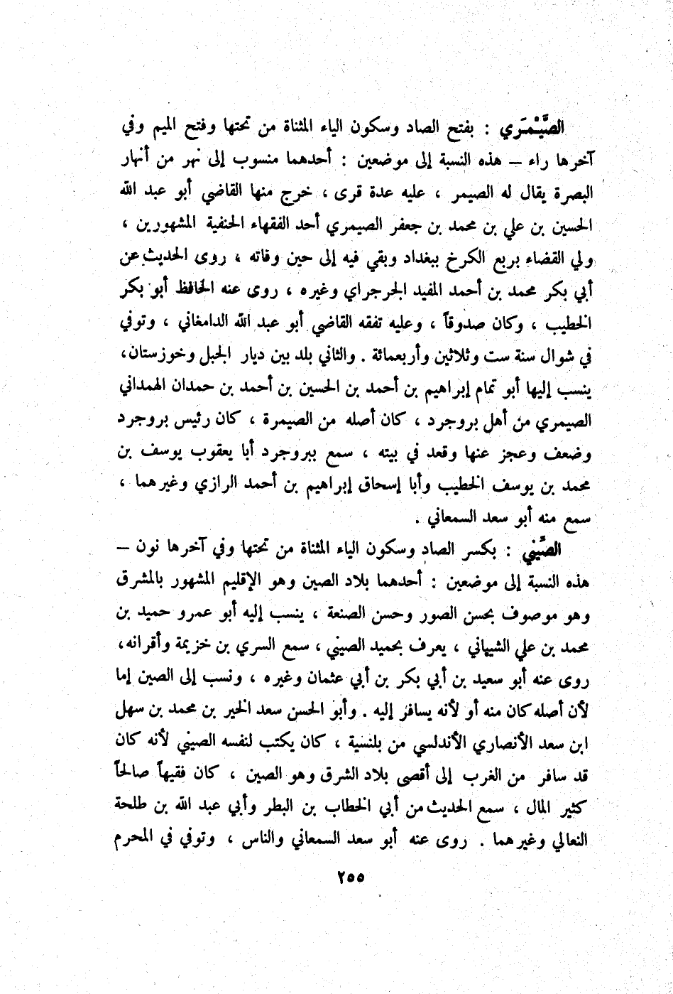 الصيني بِكَسْر الصَّاد وَسُكُون الْيَاء الْمُثَنَّاة من تحتهَا وَفِي آخرهَا نون - هَذِه النِّسْبَة إِلَى موضِعين أَحدهمَا بِلَاد الصين وَهُوَ الإقليم الْمَشْهُور بالمشرق وَهُوَ مَوْصُوف بِحسن الصُّور وَحسن الصَّنْعَة ينْسب إِلَيْهِ أَبُو عَمْرو حميد بن مُحَمَّد بن عَليّ الشَّيْبَانِيّ يعرف بحميد الصيني سمع السّري بن خُزَيْمَة وأقرانه روى عَنهُ أَبُو سعيد بن أبي بكر بن أبي عُثْمَان وَغَيره وَنسب إِلَى الصين إِمَّا لِأَن أَصله كَانَ مِنْهُ أَو لِأَنَّهُ يُسَافر إِلَيْهِ وَأَبُو الْحسن سعد الْخَيْر بن مُحَمَّد بن سهل ابْن سعد الْأنْصَارِيّ الأندلسي من بلنسية كَانَ يكْتب لنَفسِهِ الصيني لِأَنَّهُ كَانَ قد سَافر من الغرب إِلَى أقْصَى بِلَاد الشرق وَهُوَ الصين كَانَ فَقِيها صَالحا كثير المَال سمع الحَدِيث من أبي الْخطاب بن البطر وَأبي عبد الله بن طَلْحَة النعالي وَغَيرهمَا روى عَنهُ أَبُو سعد السَّمْعَانِيّ وَالنَّاس وَتُوفِّي فِي الْمحرم
