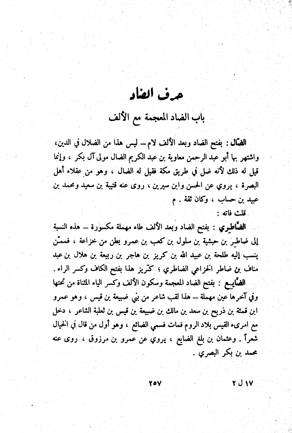 الضال بِفَتْح الضَّاد وَبعد الْألف لَام - لَيْسَ هَذَا من الضلال فِي الدّين واشتهر بهَا أَبُو عبد الرَّحْمَن مُعَاوِيَة بن عبد الْكَرِيم الضال مولى آل بكر وَإِنَّمَا قيل لَهُ ذَلِك لِأَنَّهُ ضل فِي طَرِيق مَكَّة فَقيل لَهُ الضال وَهُوَ من عقلاء أهل الْبَصْرَة يروي عَن الْحسن وَابْن سِيرِين روى عَنهُ قُتَيْبَة بن سعيد وَمُحَمّد بن عبيد بن حِسَاب وَكَانَ ثِقَة م