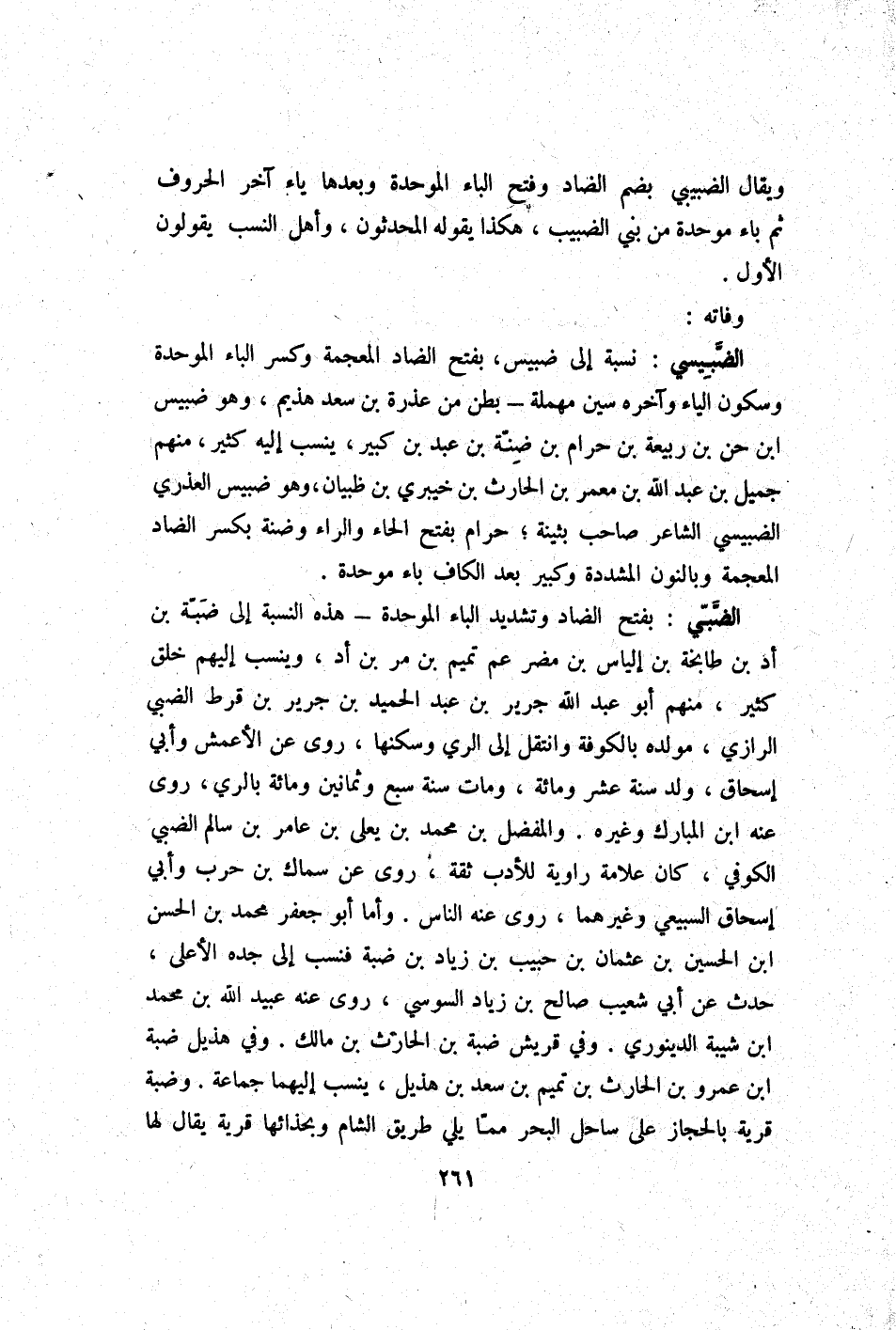 الضَّبِّيّ بِفَتْح الضَّاد وَتَشْديد الْبَاء الْمُوَحدَة - هَذِه النِّسْبَة إِلَى ضبة بن أد بن طابخة بن إلْيَاس بن مُضر عَم تَمِيم بن مر بن أد وينسب إِلَيْهِم خلق كثير مِنْهُم أَبُو عبد الله جرير بن عبد الحميد بن جرير بن قرط الضَّبِّيّ الرَّازِيّ مولده بِالْكُوفَةِ وانتقل إِلَى الرّيّ وسكنها روى عَن الْأَعْمَش وَأبي إِسْحَاق ولد سنة عشر وَمِائَة وَمَات سنة سبع وَثَمَانِينَ وَمِائَة بِالريِّ روى عَنهُ ابْن الْمُبَارك وَغَيره والمفضل بن مُحَمَّد بن يعلى بن عَامر بن سَالم الضَّبِّيّ الْكُوفِي كَانَ عَلامَة راوية للأدب ثِقَة روى عَن سماك بن حَرْب وابي إِسْحَاق السبيعِي وَغَيرهمَا روى عَنهُ النَّاس وَأما أَبُو جَعْفَر مُحَمَّد بن الْحسن ابْن الْحُسَيْن بن 4 عُثْمَان بن حبيب بن زِيَاد بن ضبة فنسب إِلَى جده الْأَعْلَى حدث عَن أبي شُعَيْب صَالح بن زِيَاد السُّوسِي روى عَنهُ عبيد الله بن مُحَمَّد ابْن شيبَة الدينَوَرِي وَفِي قُرَيْش ضبة بن الْحَارِث بن مَالك وَفِي هُذَيْل ضبة ابْن عَمْرو بن الْحَارِث بن تَمِيم بن سعد بن هُذَيْل ينْسب إِلَيْهَا جمَاعَة وضبة قَرْيَة بالحجاز على سَاحل الْبَحْر مِمَّا يَلِي طَرِيق الشَّام وبحذائها قَرْيَة يُقَال لَهَا