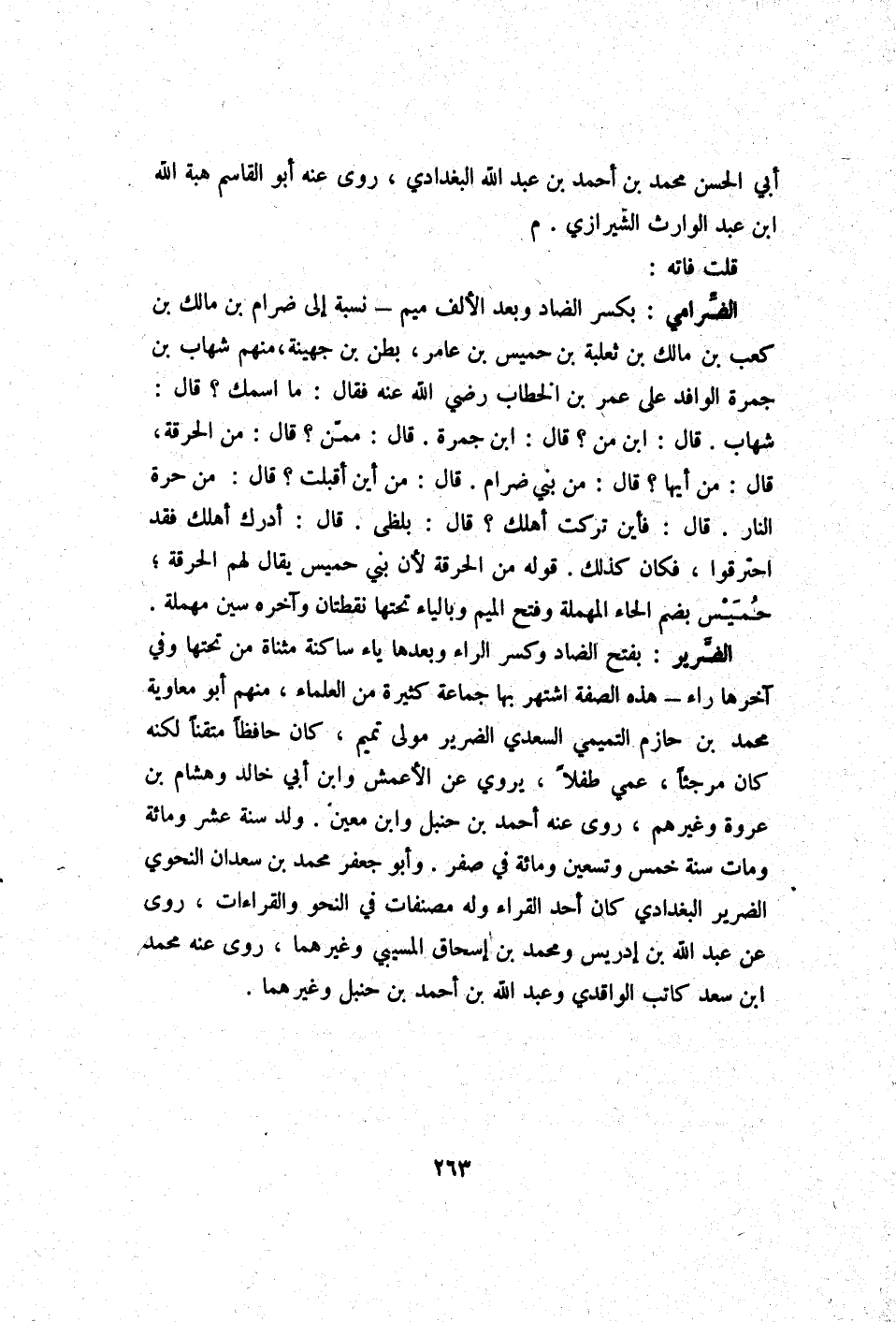 الضَّرِير بِفَتْح الضَّاد وَكسر الرَّاء وَبعدهَا يَاء سَاكِنة مثناة من تحتهَا وَفِي آخرهَا رَاء - هَذِه الصّفة اشْتهر بهَا جمَاعَة كَثِيرَة من الْعلمَاء مِنْهُم أَبُو مُعَاوِيَة مُحَمَّد بن حَازِم التَّمِيمِي السَّعْدِيّ الضَّرِير مولى تَمِيم كَانَ حَافِظًا متقنا لكنه كَانَ مرجئا عمي طفْلا يروي عَن الْأَعْمَش وَابْن أبي خَالِد وَهِشَام بن عُرْوَة وَغَيرهم روى عَنهُ أَحْمد بن حَنْبَل وَابْن معِين ولد سنة عشر وَمِائَة وَمَات سنة خمس وَتِسْعين وَمِائَة فِي صفر وَأَبُو جَعْفَر مُحَمَّد بن سَعْدَان النَّحْوِيّ الضَّرِير الْبَغْدَادِيّ كَانَ أحد الْقُرَّاء وَله مصنفات فِي النَّحْو والقراءات روى عَن عبد الله بن إِدْرِيس وَمُحَمّد بن إِسْحَاق الْمسَيبِي وَغَيرهمَا روى عَنهُ مُحَمَّد ابْن سعد كَاتب الْوَاقِدِيّ وَعبد الله بن أَحْمد بن حَنْبَل وَغَيرهمَا