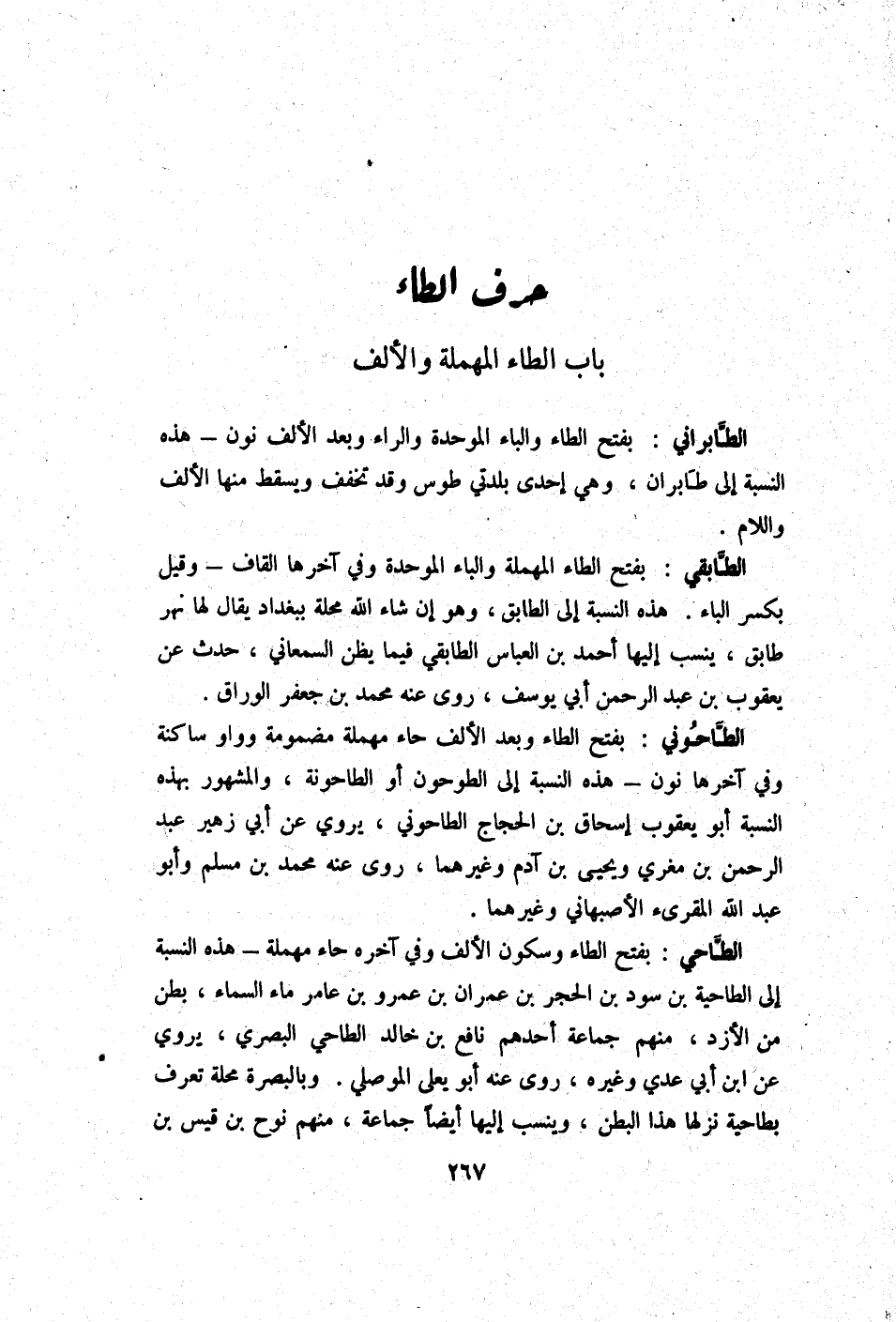 الطابراني بِفَتْح الطَّاء وَالْبَاء الْمُوَحدَة وَالرَّاء وَبعد الْألف نون - هَذِه النِّسْبَة إِلَى طابران وَهِي إِحْدَى بلدتي طوس وَقد تخفف وَيسْقط مِنْهَا الْألف وَاللَّام