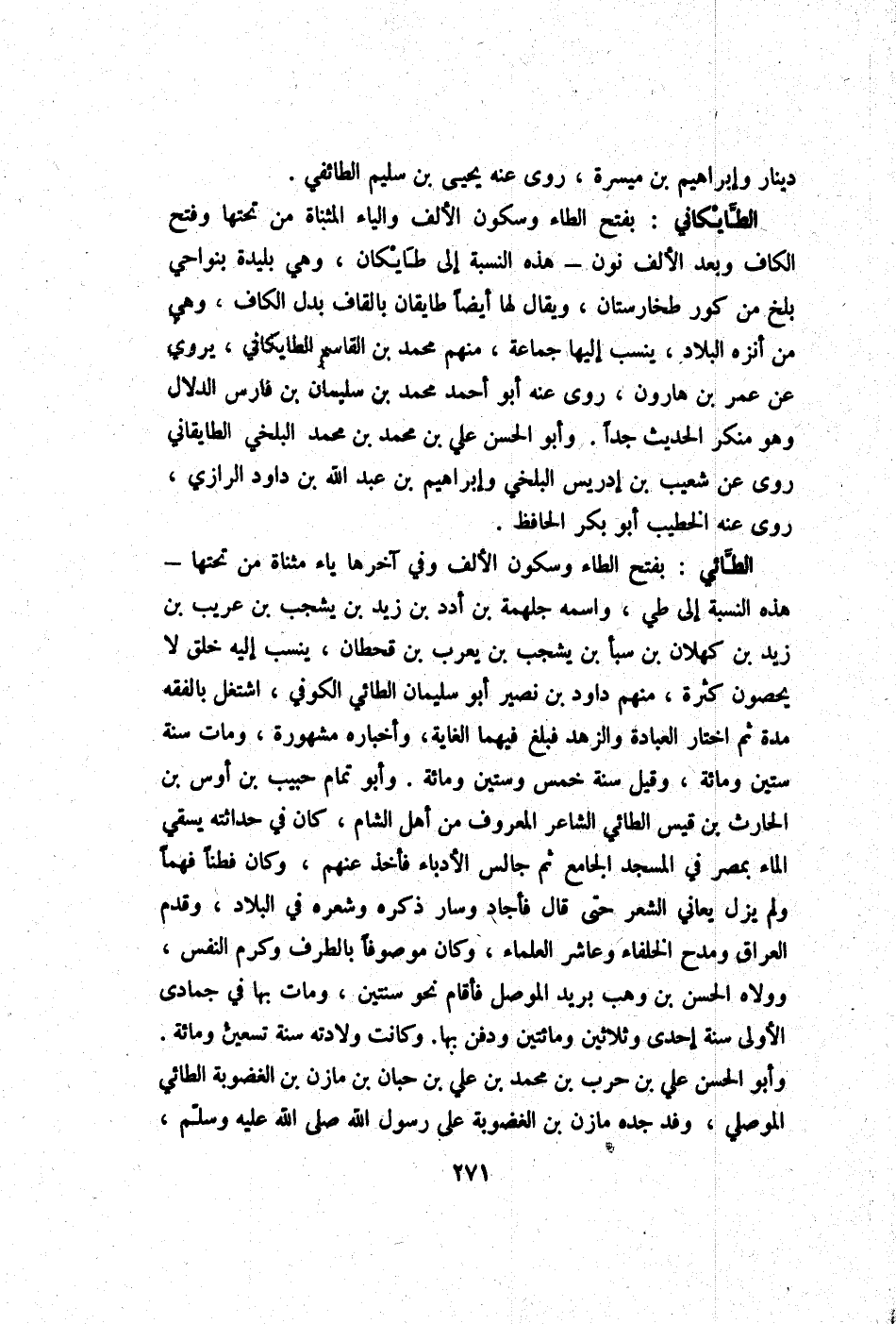 الطَّائِي بِفَتْح الطَّاء وَسُكُون الْألف وَفِي آخرهَا يَاء مثناة من تحتهَا - هَذِه النِّسْبَة إِلَى طي واسْمه جلهمة بن أدد بن زيد بن يشجب بن عريب بن زيد بن كهلان بن سبأ بن يشجب بن يعرب بن قحطان ينْسب إِلَيْهِ خلق لَا يُحصونَ كَثْرَة مِنْهُم دَاوُد بن نصير أَبُو سُلَيْمَان الطَّائِي الْكُوفِي اشْتغل بالفقه مُدَّة ثمَّ اخْتَار الْعِبَادَة والزهد فَبلغ فيهمَا الْغَايَة وأخباره مَشْهُورَة وَمَات سنة سِتِّينَ وَمِائَة وَقيل سنة خمس وَسِتِّينَ وَمِائَة وَأَبُو تَمام حبيب بن أَوْس بن الْحَارِث بن قيس الطَّائِي الشَّاعِر الْمَعْرُوف من أهل الشَّام كَانَ فِي حداثته يسْقِي المَاء بِمصْر فِي الْمَسْجِد الْجَامِع ثمَّ جَالس الأدباء فَأخذ عَنْهُم وَكَانَ فطنا فهما وَلم يزل يعاني الشّعْر حَتَّى قَالَ فأجاد وَسَار ذكره وشعره فِي الْبِلَاد وَقدم الْعرَاق ومدح الْخُلَفَاء وعاشر الْعلمَاء وَكَانَ مَوْصُوفا بالطرف وكرم النَّفس وولاه الْحسن بن وهب بريد الْموصل فَأَقَامَ نَحْو سنتَيْن وَمَات بهَا فِي جُمَادَى الأولى سنة إِحْدَى وَثَلَاثِينَ وَمِائَتَيْنِ وَدفن بهَا وَكَانَت وِلَادَته سنة تسعين وَمِائَة وَأَبُو الْحسن عَليّ بن حَرْب بن مُحَمَّد بن عَليّ بن حبَان بن مَازِن بن الغضوبة الطَّائِي الْموصِلِي وَفد جده مَازِن بن الغضوبة على رَسُول الله صلى الله عَلَيْهِ وَسلم