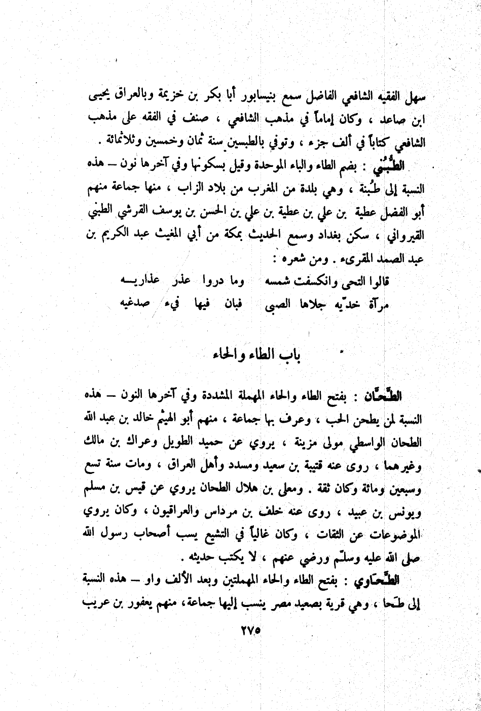 الطَّحَاوِيّ بِفَتْح الطَّاء والحاء الْمُهْمَلَتَيْنِ وَبعد الْألف وَاو - هَذِه النِّسْبَة إِلَى طحا وَهِي قَرْيَة بصعيد مصر ينْسب إِلَيْهَا جمَاعَة مِنْهُم يَعْفُور بن عريب