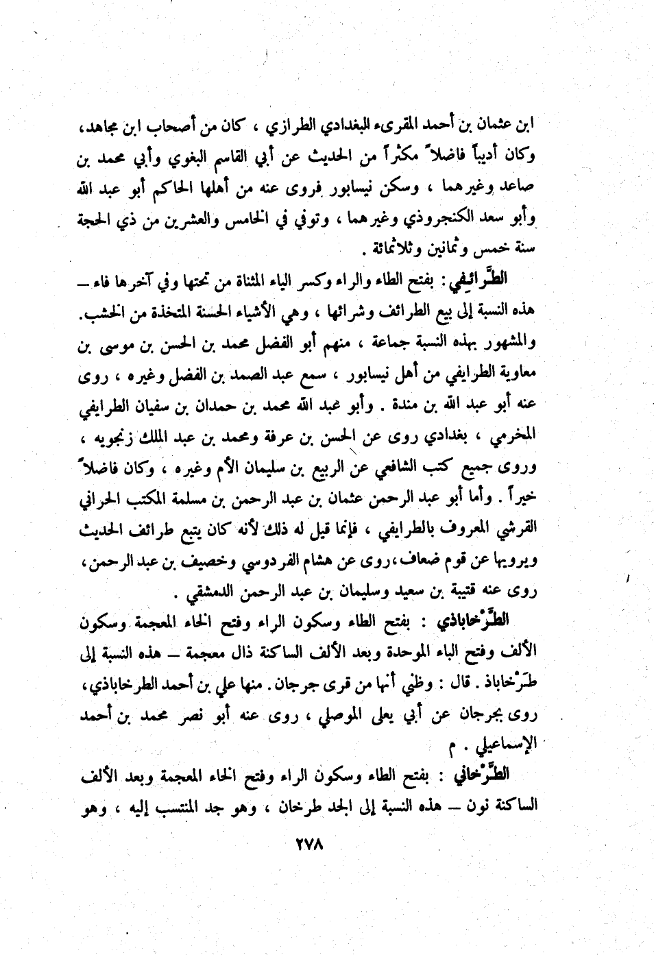 الطرائفي بِفَتْح الطَّاء وَالرَّاء وَكسر الْيَاء الْمُثَنَّاة من تحتهَا وَفِي آخرهَا فَاء - هَذِه النِّسْبَة إِلَى بيع الطرائف وشرائها وَهِي الْأَشْيَاء الْحَسَنَة المتخذة من الْخشب وَالْمَشْهُور بِهَذِهِ النِّسْبَة جمَاعَة مِنْهُم أَبُو الْفضل مُحَمَّد بن الْحسن بن مُوسَى بن مُعَاوِيَة الطرايفي من أهل نيسابور سمع عبد الصَّمد بن الْفضل وَغَيره روى عَنهُ أَبُو عبد الله بن مندة وَأَبُو عبد الله مُحَمَّد بن حمدَان بن سُفْيَان الطرايفي المخرمي بغدادي روى عَن الْحسن بن عَرَفَة وَمُحَمّد بن عبد الْملك زَنْجوَيْه وروى جَمِيع كتب الشَّافِعِي عَن الرّبيع بن سُلَيْمَان الْأُم وَغَيره وَكَانَ فَاضلا خيرا وَأما أَبُو عبد الرَّحْمَن عُثْمَان بن عبد الرَّحْمَن بن مسلمة الْمكتب الْحَرَّانِي الْقرشِي الْمَعْرُوف بالطرايفي فَإِنَّمَا قيل لَهُ ذَلِك لِأَنَّهُ كَانَ يتبع طرائف الحَدِيث ويرويها عَن قوم ضِعَاف روى عَن هِشَام الفردوسي وخصيف بن عبد الرَّحْمَن روى عَنهُ قُتَيْبَة بن سعيد وَسليمَان بن عبد الرَّحْمَن الدِّمَشْقِي
