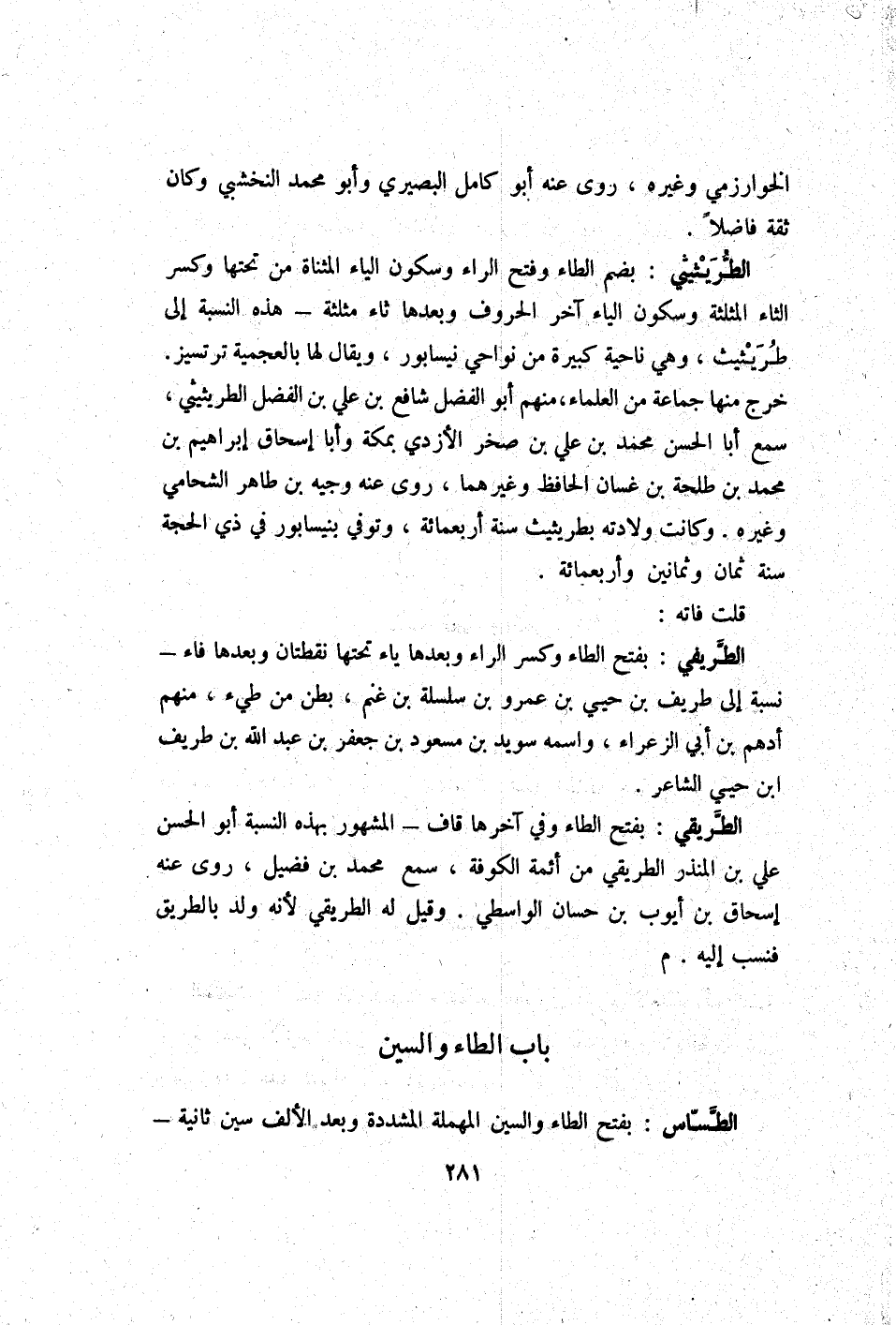 الطريثيثي بِضَم الطَّاء وَفتح الرَّاء وَسُكُون الْيَاء الْمُثَنَّاة من تحتهَا وَكسر الثَّاء الْمُثَلَّثَة وَسُكُون الْيَاء آخر الْحُرُوف وَبعدهَا ثاء مُثَلّثَة - هَذِه النِّسْبَة إِلَى طريثيث وَهِي نَاحيَة كَبِيرَة من نواحي نيسابور وَيُقَال لَهَا بالعجمية ترتسيز خرج مِنْهَا جمَاعَة من الْعلمَاء مِنْهُم أَبُو الْفضل شَافِع بن عَليّ بن الْفضل الطريثيثي سمع أَبَا الْحسن مُحَمَّد بن عَليّ بن صَخْر الْأَزْدِيّ بِمَكَّة وَأَبا إِسْحَاق إِبْرَاهِيم بن مُحَمَّد بن طَلْحَة بن غَسَّان الْحَافِظ وَغَيرهمَا روى عَنهُ وجيه بن طَاهِر الشحامي وَغَيره وَكَانَت وِلَادَته بطريثيث سنة أَرْبَعمِائَة وَتُوفِّي بنيسابور فِي ذِي الْحجَّة سنة ثَمَان وَثَمَانِينَ وَأَرْبَعمِائَة