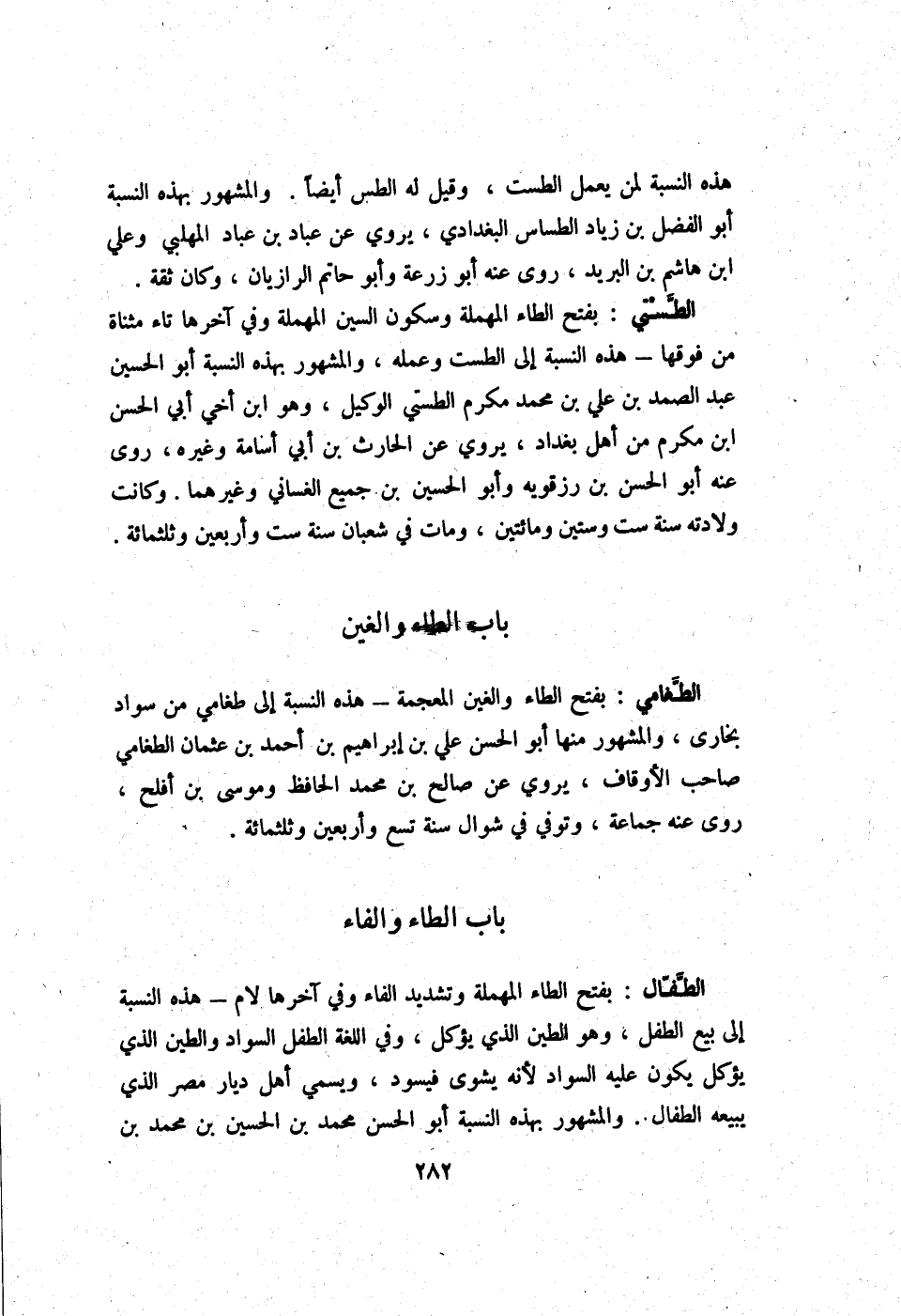 الطفال بِفَتْح الطَّاء الْمُهْملَة وَتَشْديد الْفَاء وَفِي آخرهَا لَام - هَذِه النِّسْبَة إِلَى بيع الطِّفْل وَهُوَ الطين الَّذِي يُؤْكَل وَفِي اللُّغَة الطِّفْل السوَاد والطين الَّذِي يُؤْكَل يكون عَلَيْهِ السوَاد لِأَنَّهُ يشوى فيسود ويسمي أهل ديار مصر الَّذِي يَبِيعهُ الطفال وَالْمَشْهُور بِهَذِهِ النِّسْبَة أَبُو الْحسن مُحَمَّد بن الْحُسَيْن بن مُحَمَّد بن