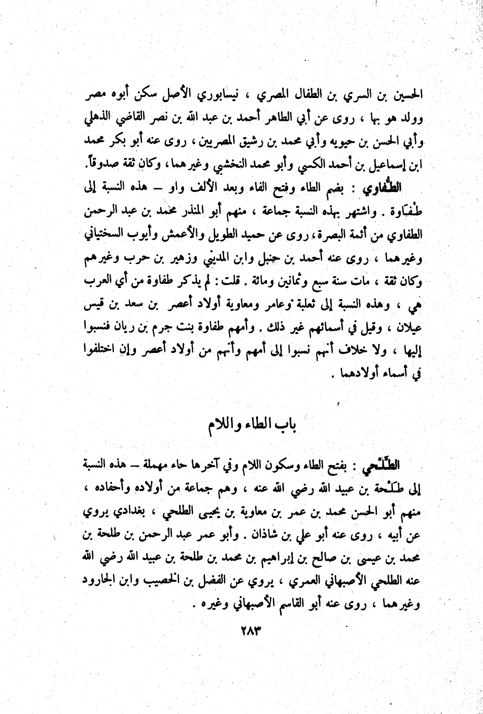 الطلحي بِفَتْح الطَّاء وَسُكُون اللَّام وَفِي آخرهَا حاء مُهْملَة - هَذِه النِّسْبَة إِلَى طَلْحَة بن عبيد الله رَضِي الله عَنهُ وهم جمَاعَة من أَوْلَاده وأحفاده مِنْهُم أَبُو الْحسن مُحَمَّد بن عمر بن مُعَاوِيَة بن يحيى الطلحي بغدادي يروي عَن أَبِيه روى عَنهُ أَبُو عَليّ بن شَاذان وَأَبُو عمر عبد الرَّحْمَن بن طَلْحَة بن مُحَمَّد بن عِيسَى بن صَالح بن إِبْرَاهِيم بن مُحَمَّد بن طَلْحَة بن عبيد الله رَضِي الله عَنهُ الطلحي الْأَصْبَهَانِيّ الْعمريّ يروي عَن الْفضل بن الخصيب وَابْن الْجَارُود وَغَيرهمَا روى عَنهُ أَبُو الْقَاسِم الْأَصْبَهَانِيّ وَغَيره