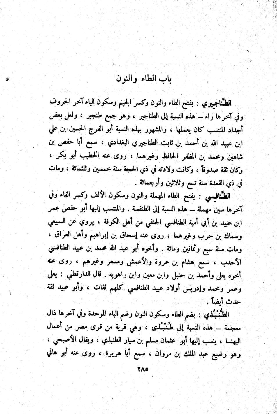 الطنافسي بِفَتْح الطَّاء الْمُهْملَة وَالنُّون وَسُكُون الْألف وَكسر الْفَاء وَفِي آخرهَا سين مُهْملَة - هَذِه النِّسْبَة إِلَى الطنفسة والمنتسب إِلَيْهَا أَبُو حَفْص عمر ابْن عبيد بن أبي أُميَّة الطنافسي الْحَنَفِيّ من أهل الْكُوفَة يروي عَن السبيعِي وَسماك بن حَرْب وَغَيرهمَا روى عَنهُ إِسْحَاق بن إِبْرَاهِيم وَأهل الْعرَاق وَمَات سنة سبع وَثَمَانِينَ وَمِائَة وَأَخُوهُ أَبُو عبد الله مُحَمَّد بن عبيد الطنافسي الأحدب سمع هِشَام بن عُرْوَة وَالْأَعْمَش ومسعر وَغَيرهم روى عَنهُ أَخُوهُ يعلى وَأحمد بن حَنْبَل وَابْن معِين وَابْن رَاهَوَيْه قَالَ الدَّارَقُطْنِيّ يعلى وَعمر وَمُحَمّد وَإِدْرِيس أَوْلَاد عبيد الطنافسي كلهم ثِقَات وَأَبُو عبيد ثِقَة حدث أَيْضا